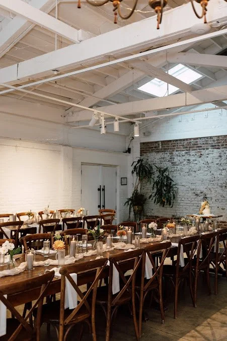 Their venue, White Chapel Projects, is as unique and cool as they come. There is the outside with the super cool white brick 3D facade, the high-walled brick courtyard where the ceremony took place, the back outside area with custom murals, the dining area featuring white brick walls and farm tables, and then the main industrial restaurant / bar area where the dancing took place. The venue was made to look even chicer with the help of florals from Blossom & Bee. Their ceremony arch and aisle arrangements were some of our favorites we have ever seen!