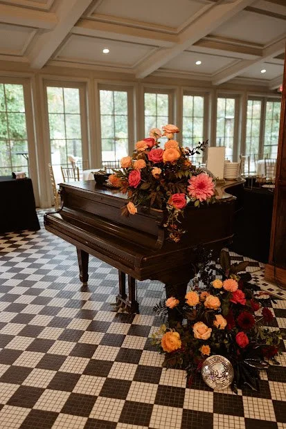 We cannot talk about B&B’s wedding without swooning over the florals. Originally Bri had wanted all black and white florals to go with the black and white motif of the venue. However, a few weeks before the wedding, she changed her mind and decided she wanted to add in bright, punchy, fall oranges, rusts and pinks. We could not be happier that she did. The result was truly a floral work of art, thanks to Bloomers Florist. Everything from the ceremony pillars to the bouquets to the moody centerpieces to the piano arrangements were not only perfect, they were also completely unique, original, and perfectly captured the couple’s essence. To establish the moody feels, they even spray painted the greenery black and used black taper candles.
