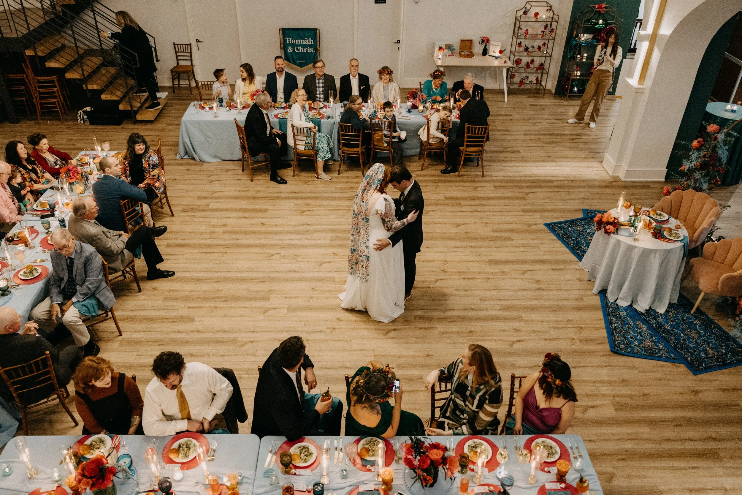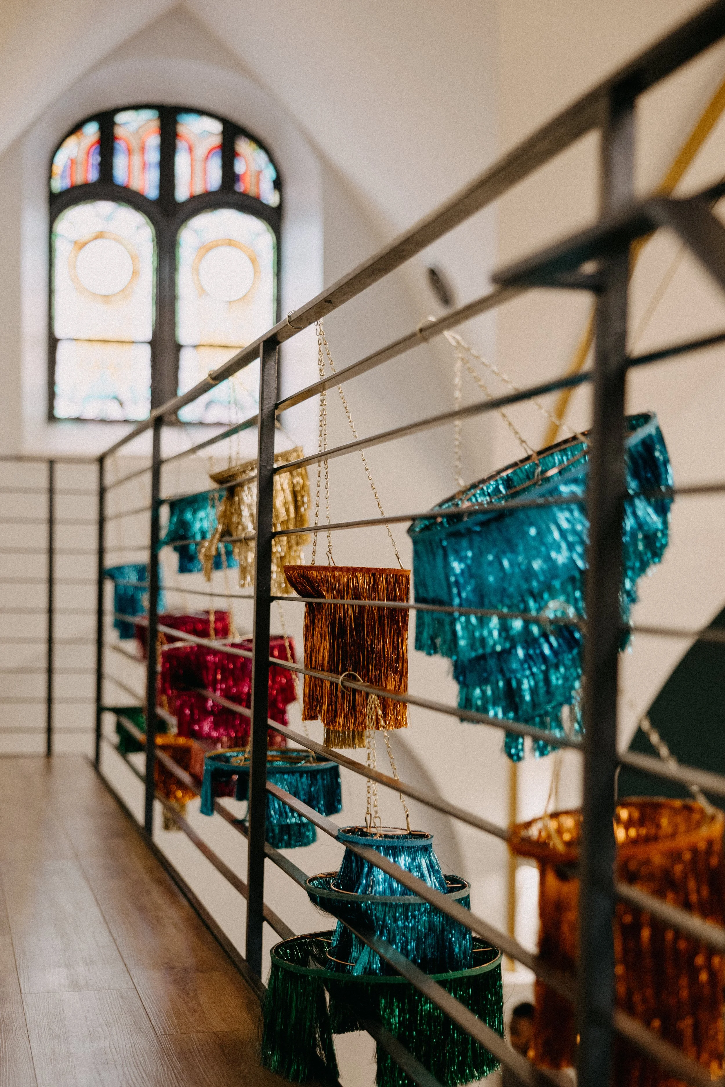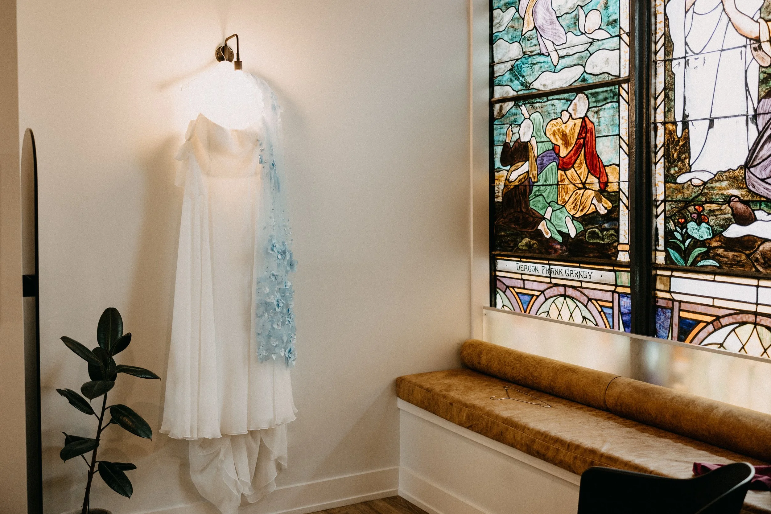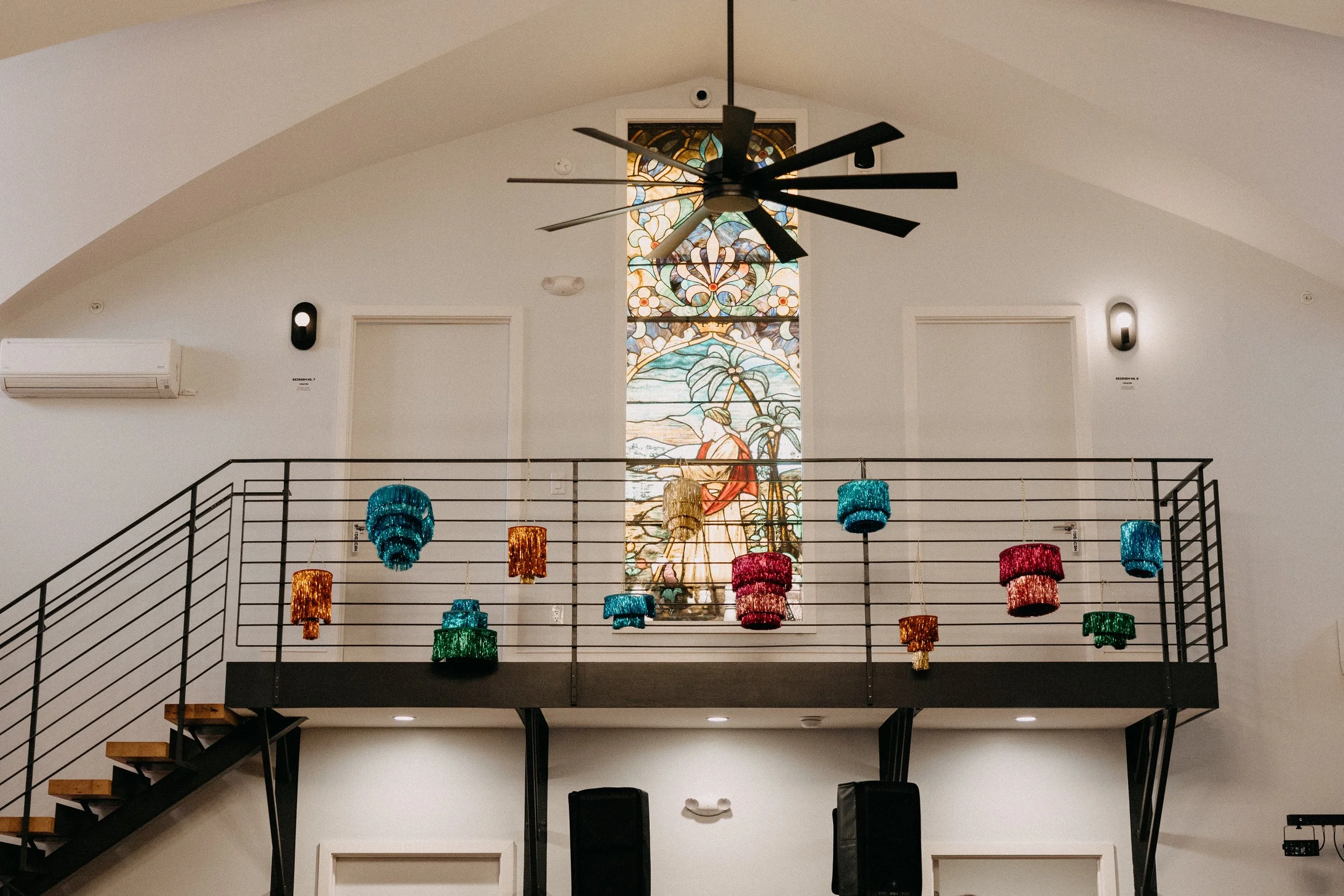 The Deacon served as the perfect nontraditional, unique wedding venue for Hannah & Chris’ big day. Their VIPs stayed in the guest rooms on-site throughout the weekend and Hannah and her crew did hair and makeup right there in the venue. The stained glass featured throughout the venue space seemed like it was tailor-made to fit the color scheme and served as a stunning backdrop for some photos. Hannah included some fun streamer chandeliers in her decor supply, so we took it upon ourselves to install them on the staircase railings that overlook the main event space.