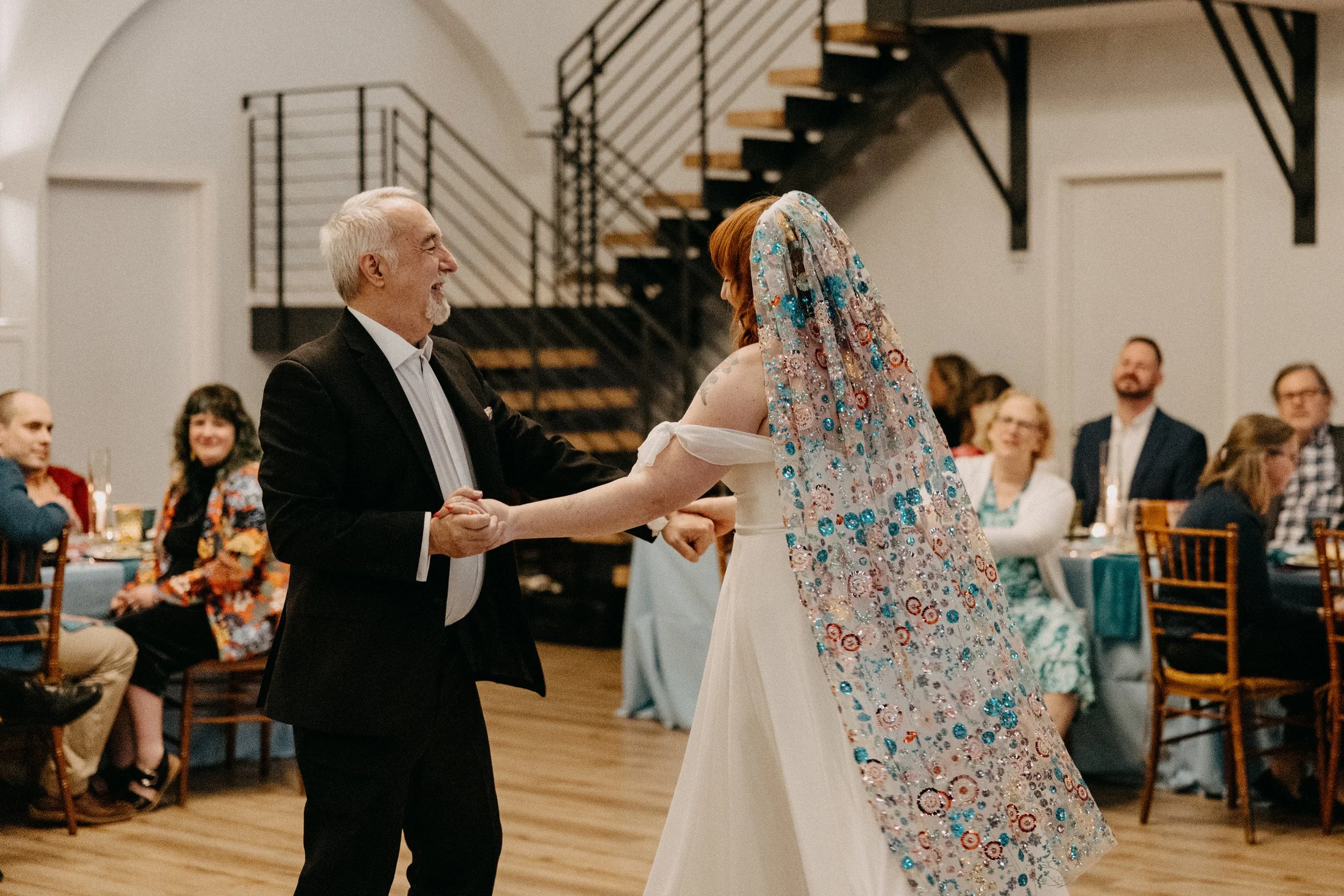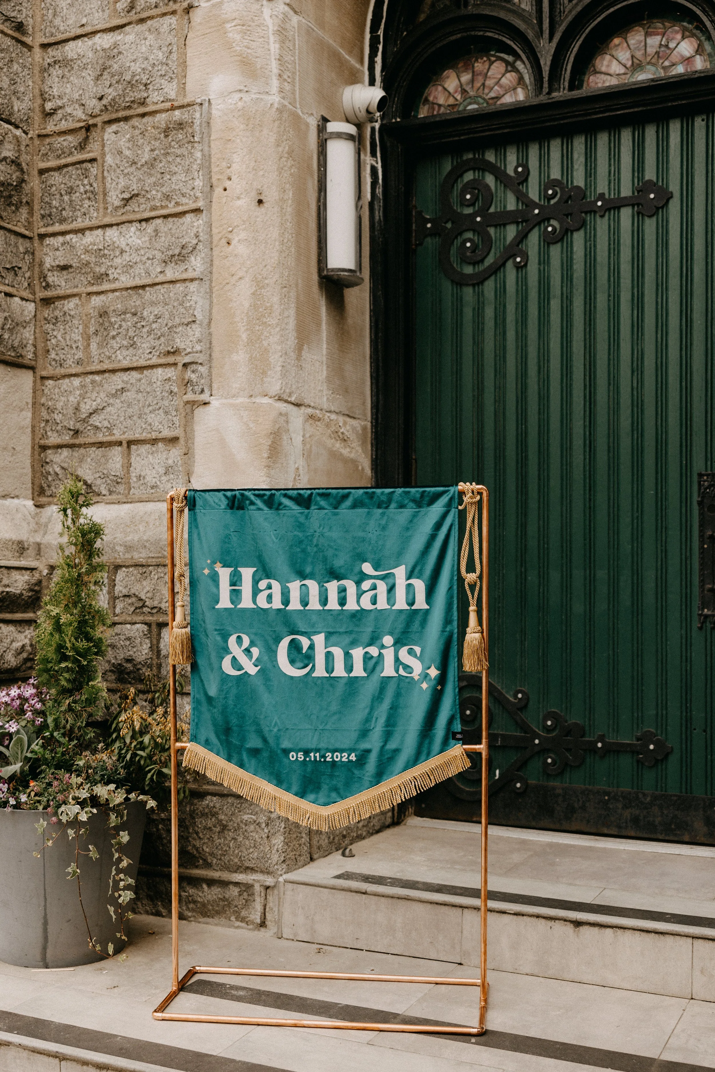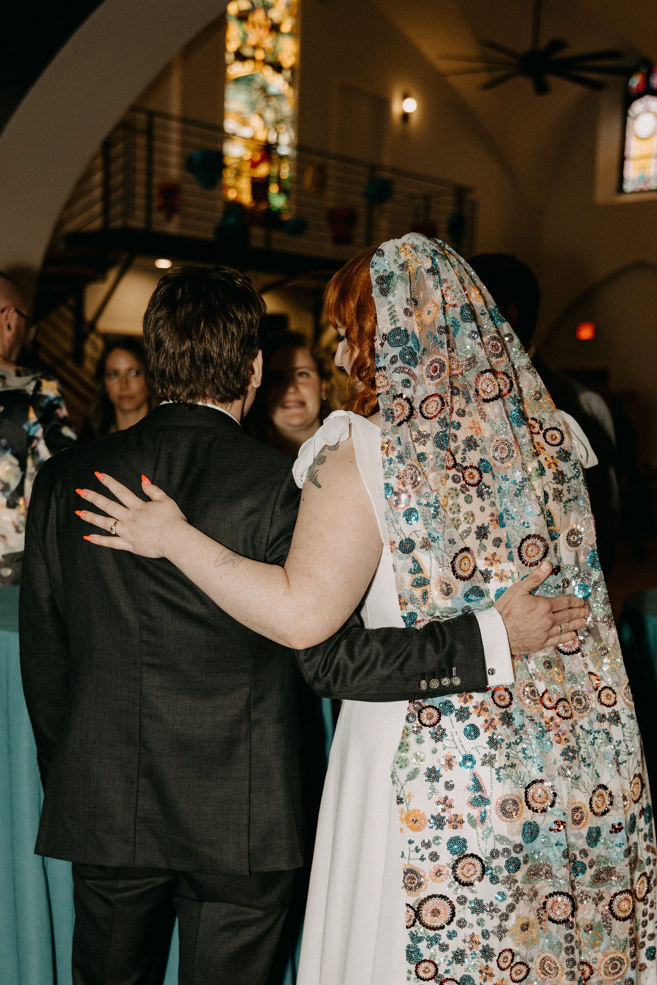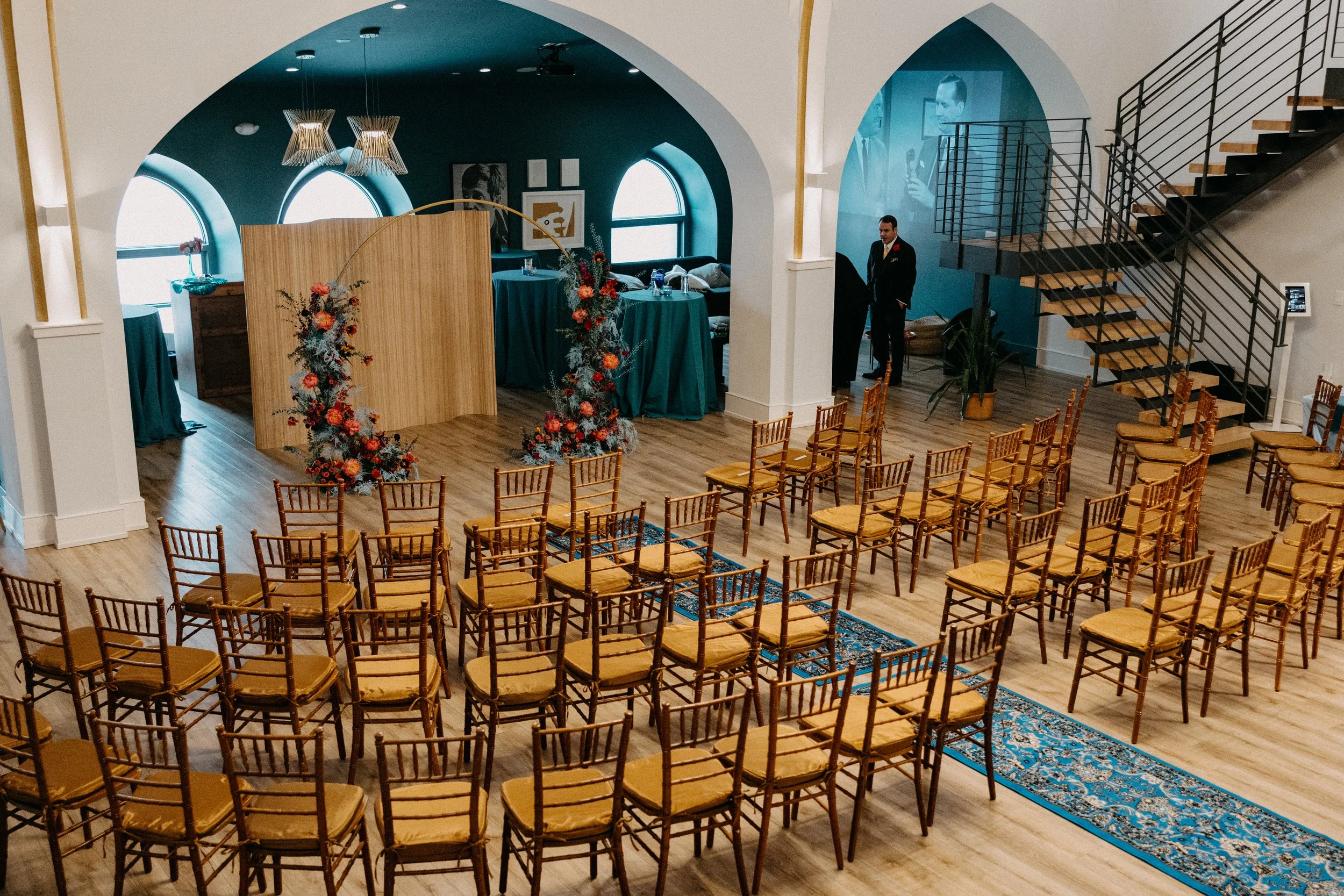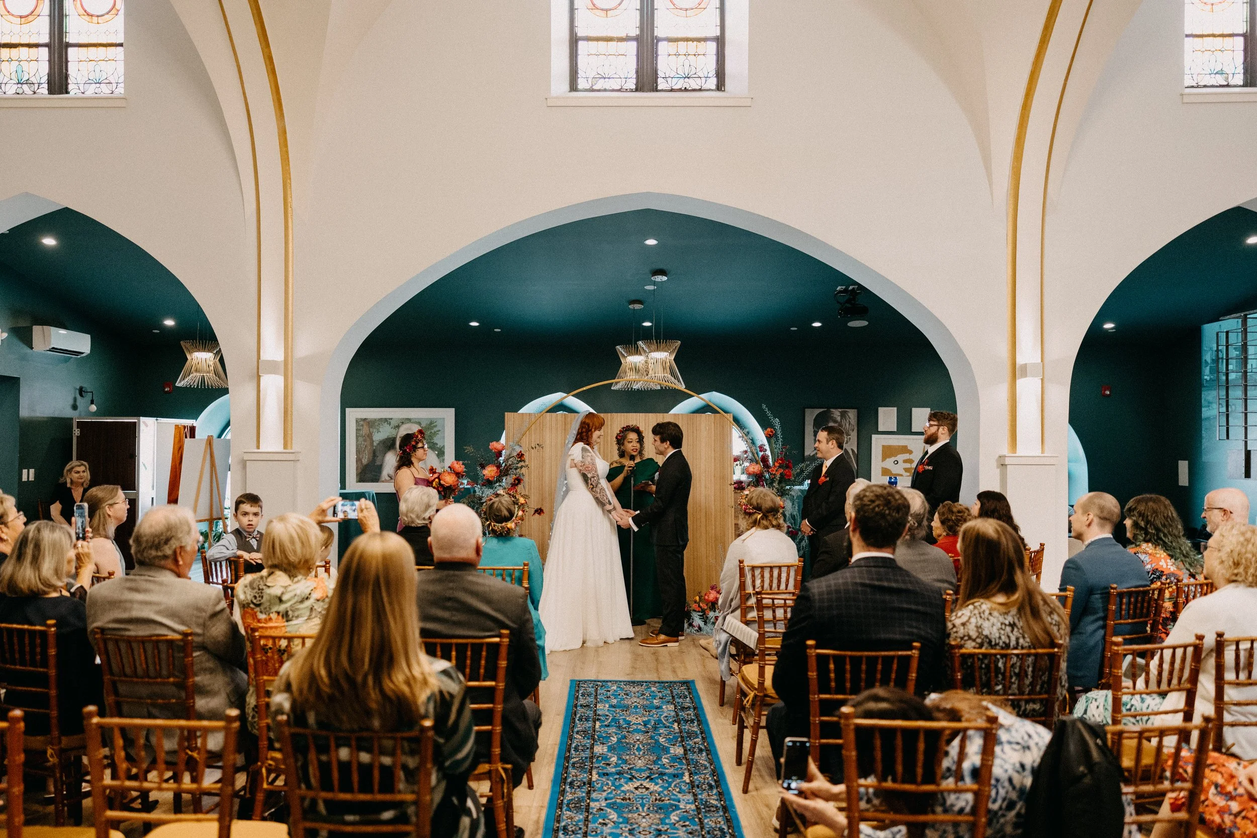 The Deacon served as the perfect nontraditional, unique wedding venue for Hannah & Chris’ big day. Their VIPs stayed in the guest rooms on-site throughout the weekend and Hannah and her crew did hair and makeup right there in the venue. The stained glass featured throughout the venue space seemed like it was tailor-made to fit the color scheme and served as a stunning backdrop for some photos. Hannah included some fun streamer chandeliers in her decor supply, so we took it upon ourselves to install them on the staircase railings that overlook the main event space.