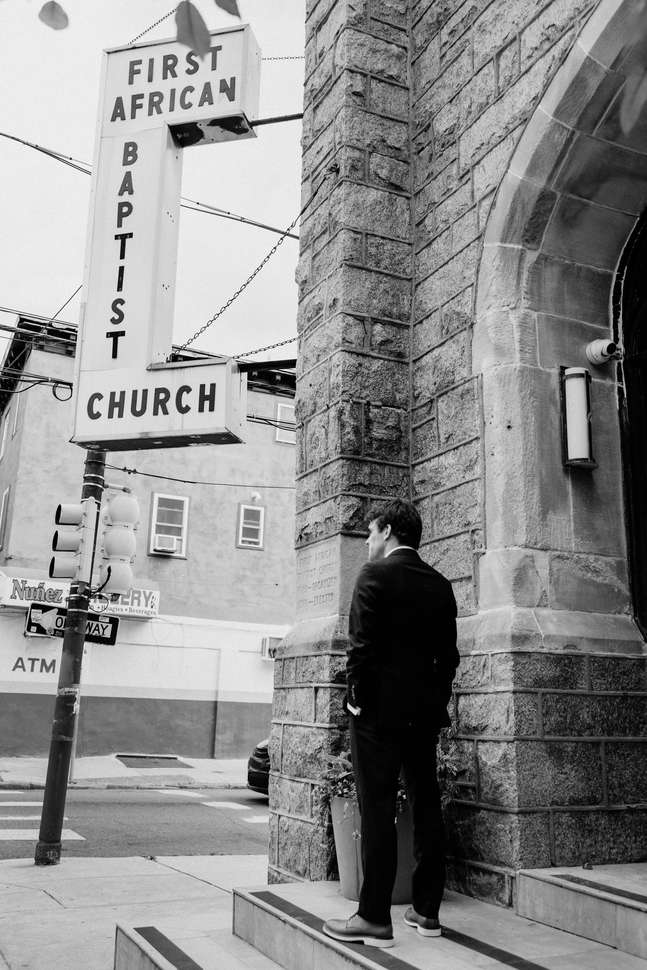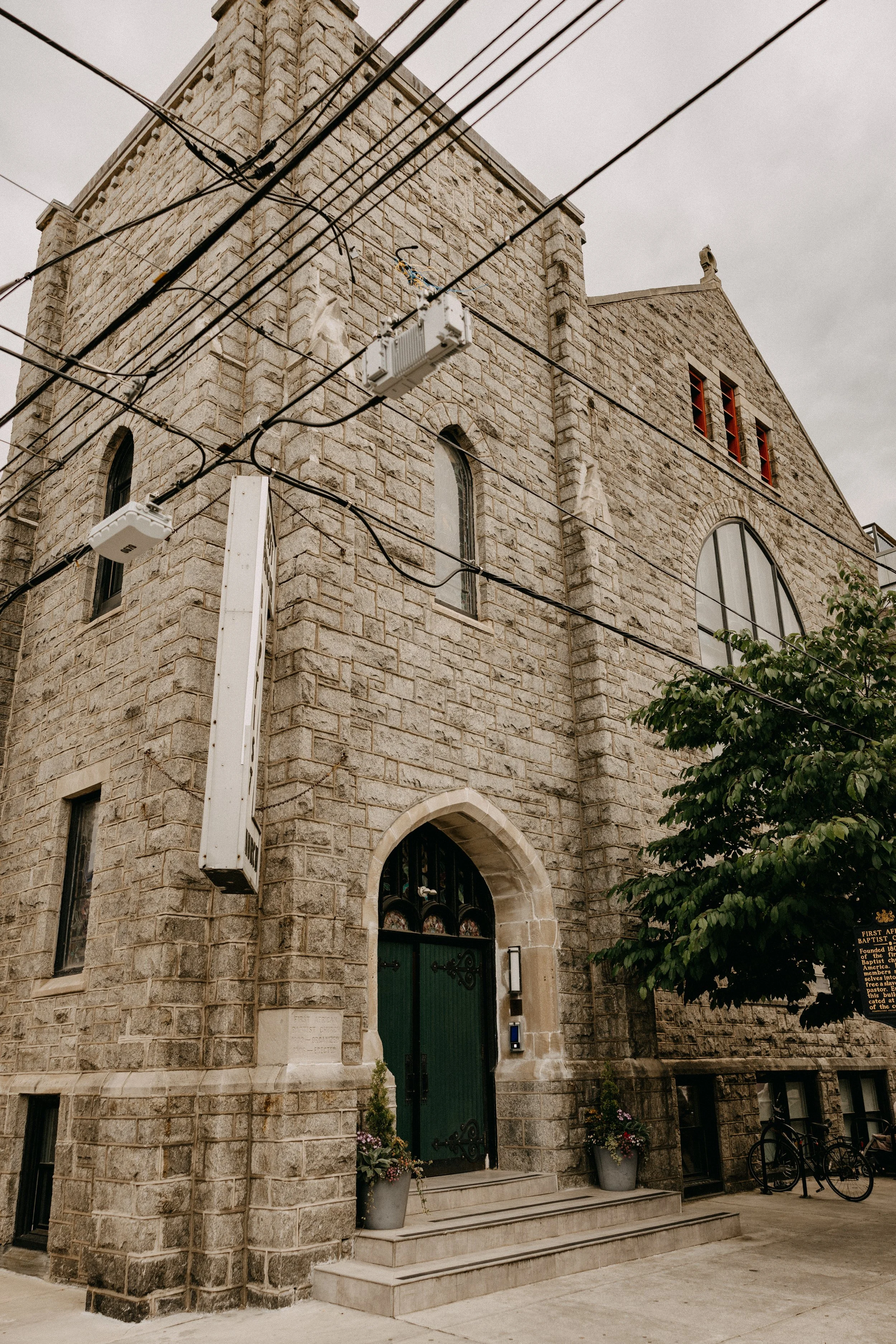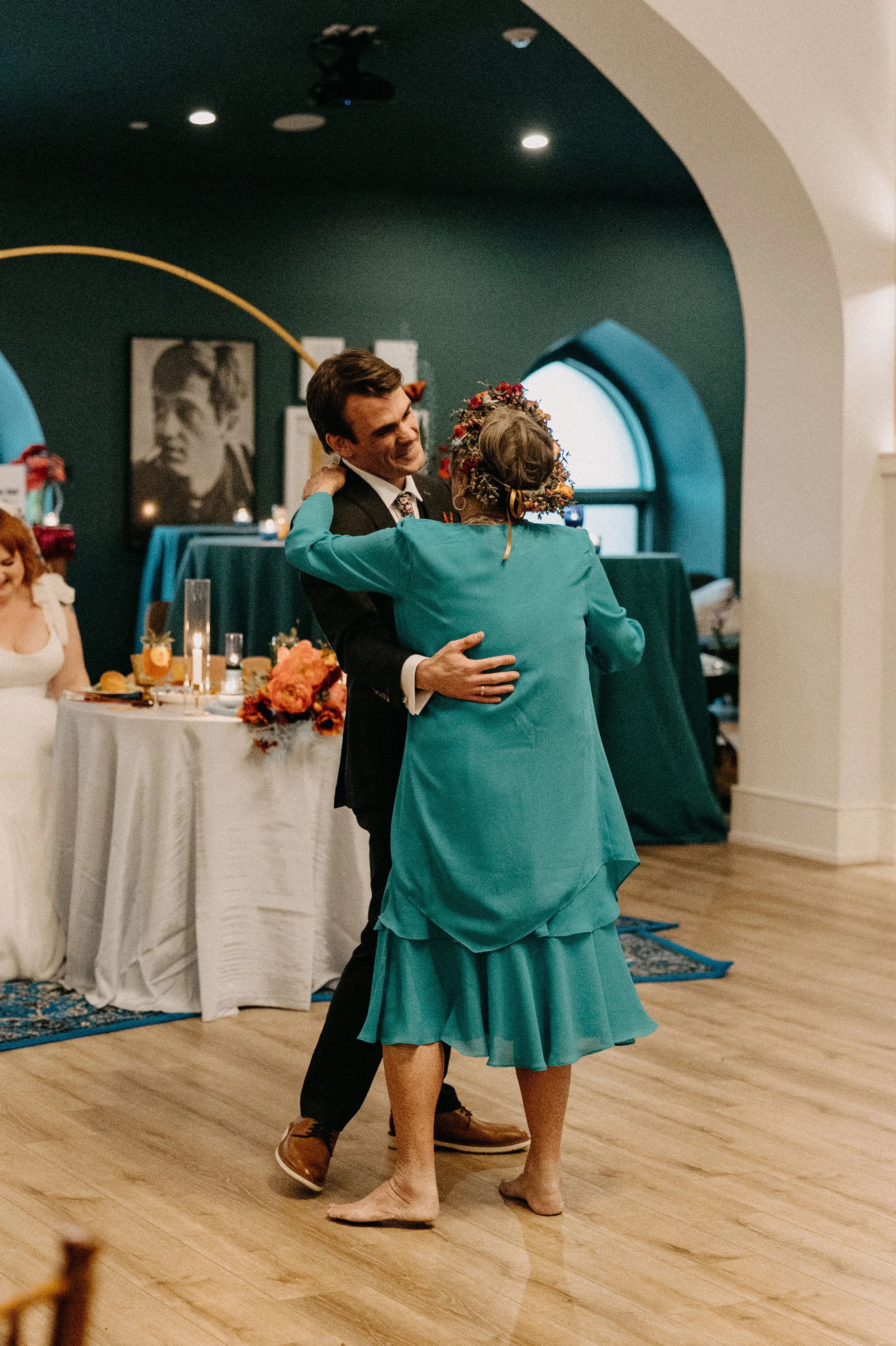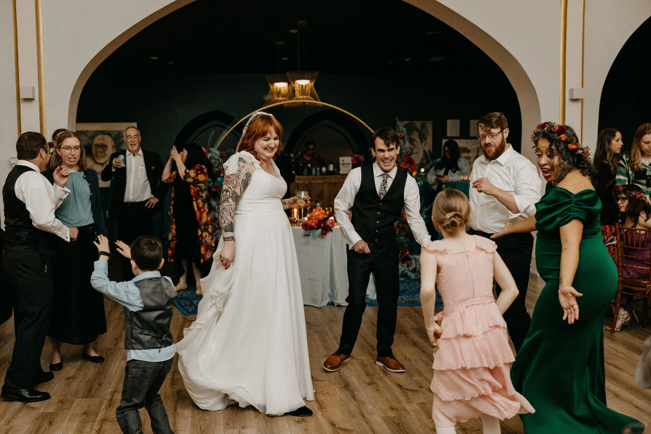The Deacon served as the perfect nontraditional, unique wedding venue for Hannah & Chris’ big day. Their VIPs stayed in the guest rooms on-site throughout the weekend and Hannah and her crew did hair and makeup right there in the venue. The stained glass featured throughout the venue space seemed like it was tailor-made to fit the color scheme and served as a stunning backdrop for some photos. Hannah included some fun streamer chandeliers in her decor supply, so we took it upon ourselves to install them on the staircase railings that overlook the main event space.