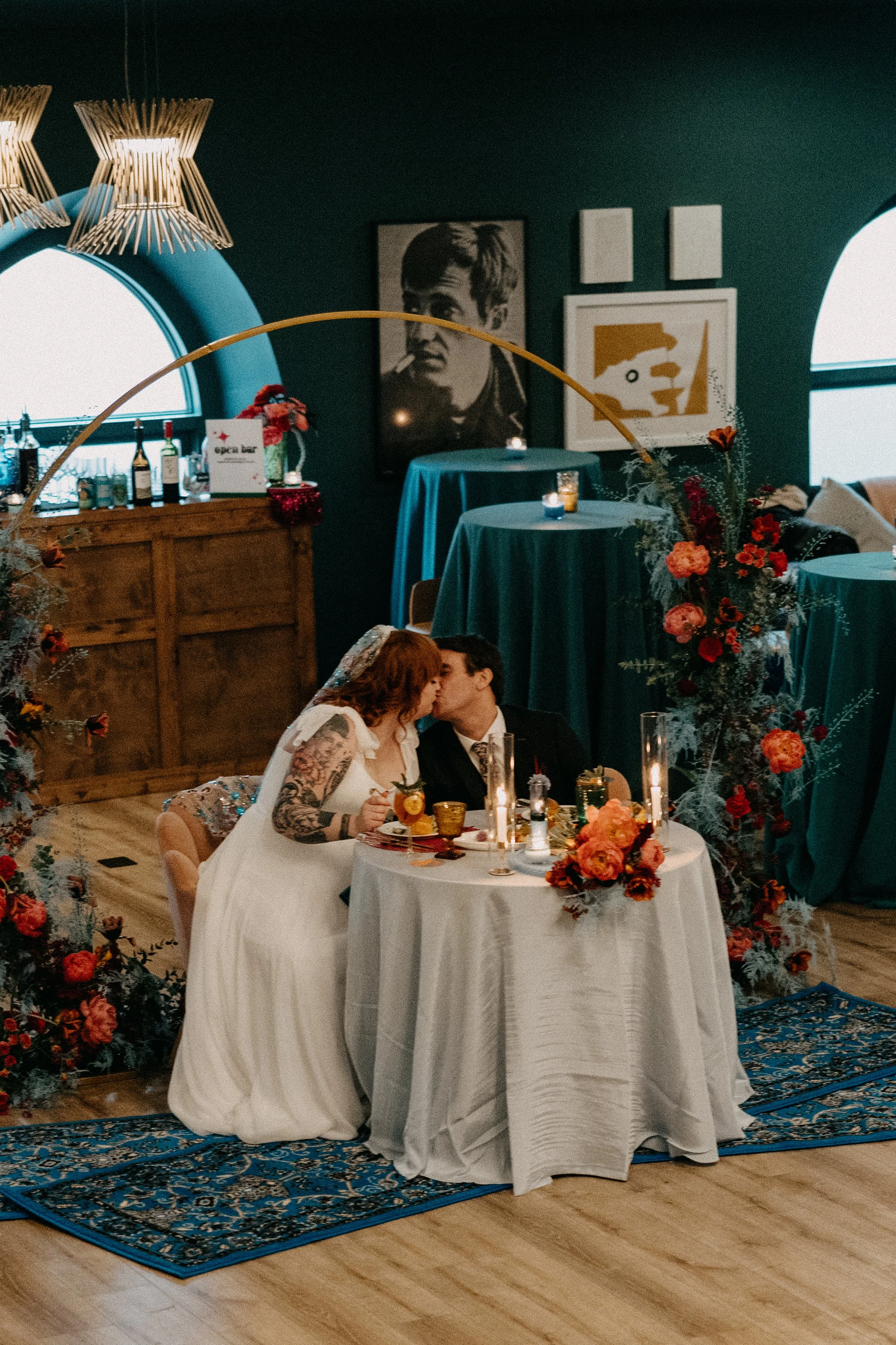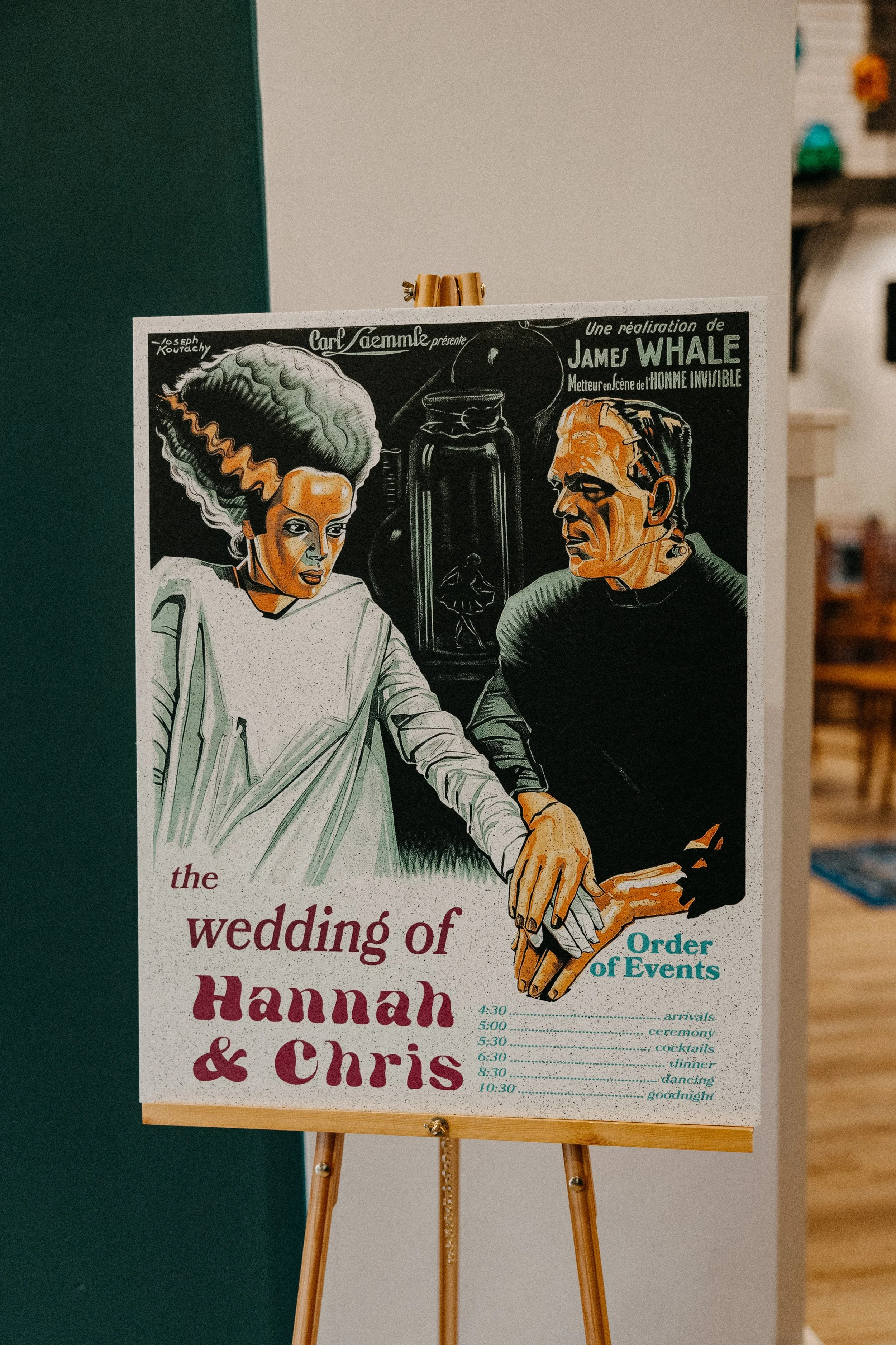 Hannah, the bride, is an artist herself. She MADE her centerpieces using Sola Wood florals (yes, wood), along with the chargers at each place setting. Also the not one, but two unbelievable veils? Yeah, she made those as well. Hannah also designed the bride-of-Frankenstein welcome sign and movie-themed seating chart. We truly believe our clients are rockstars.