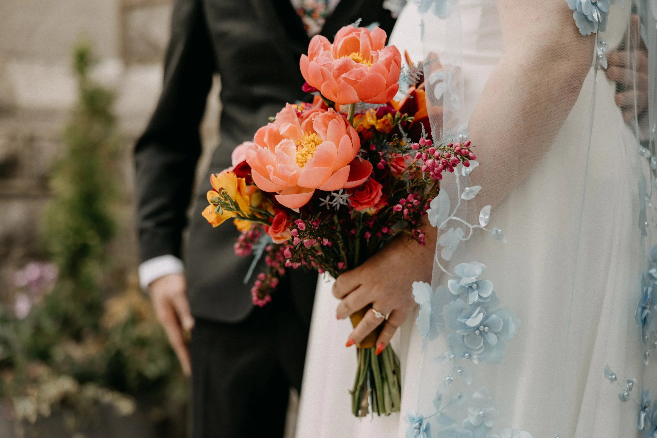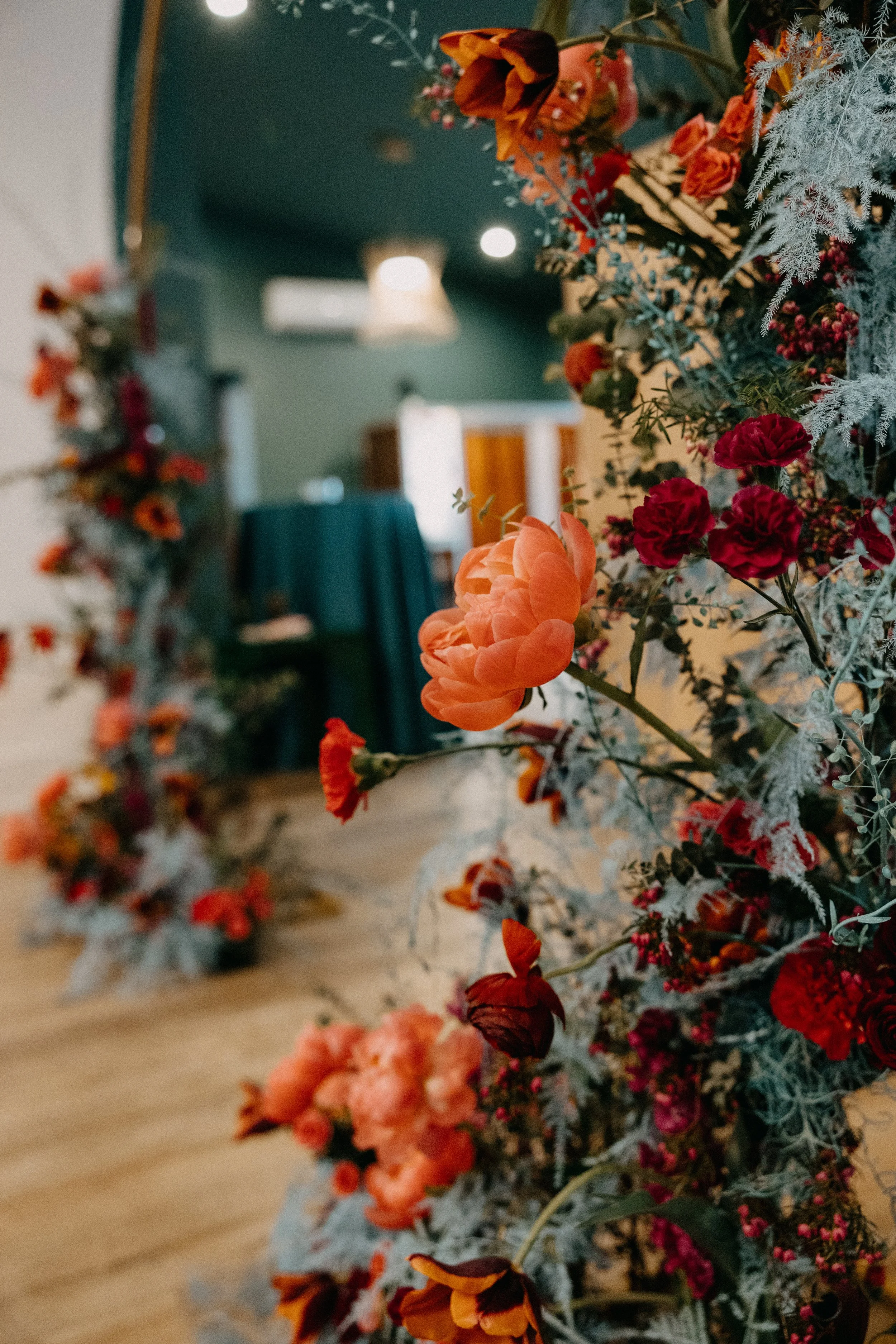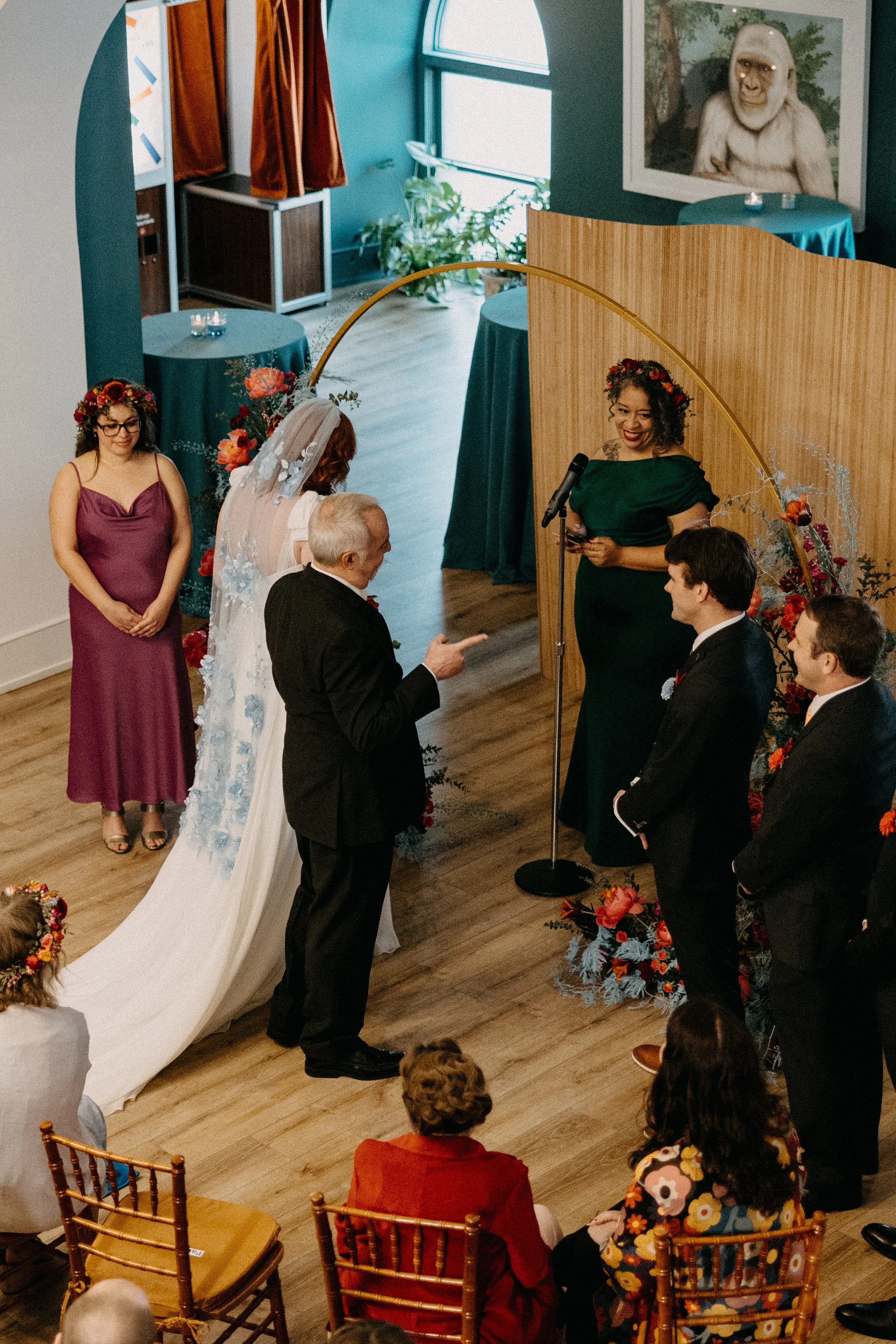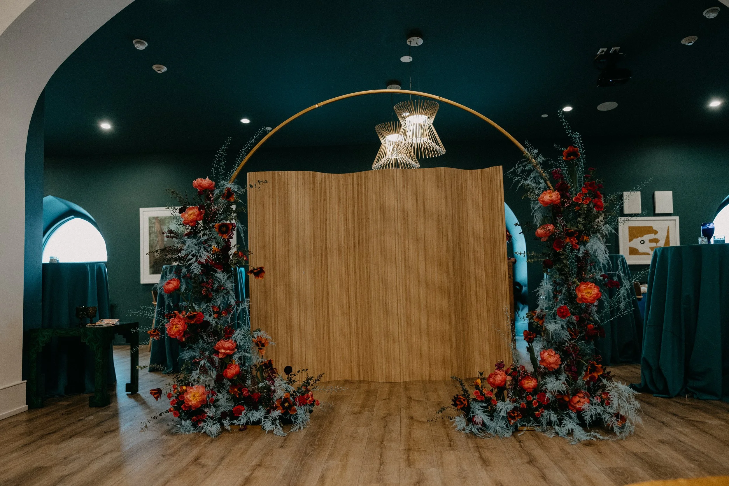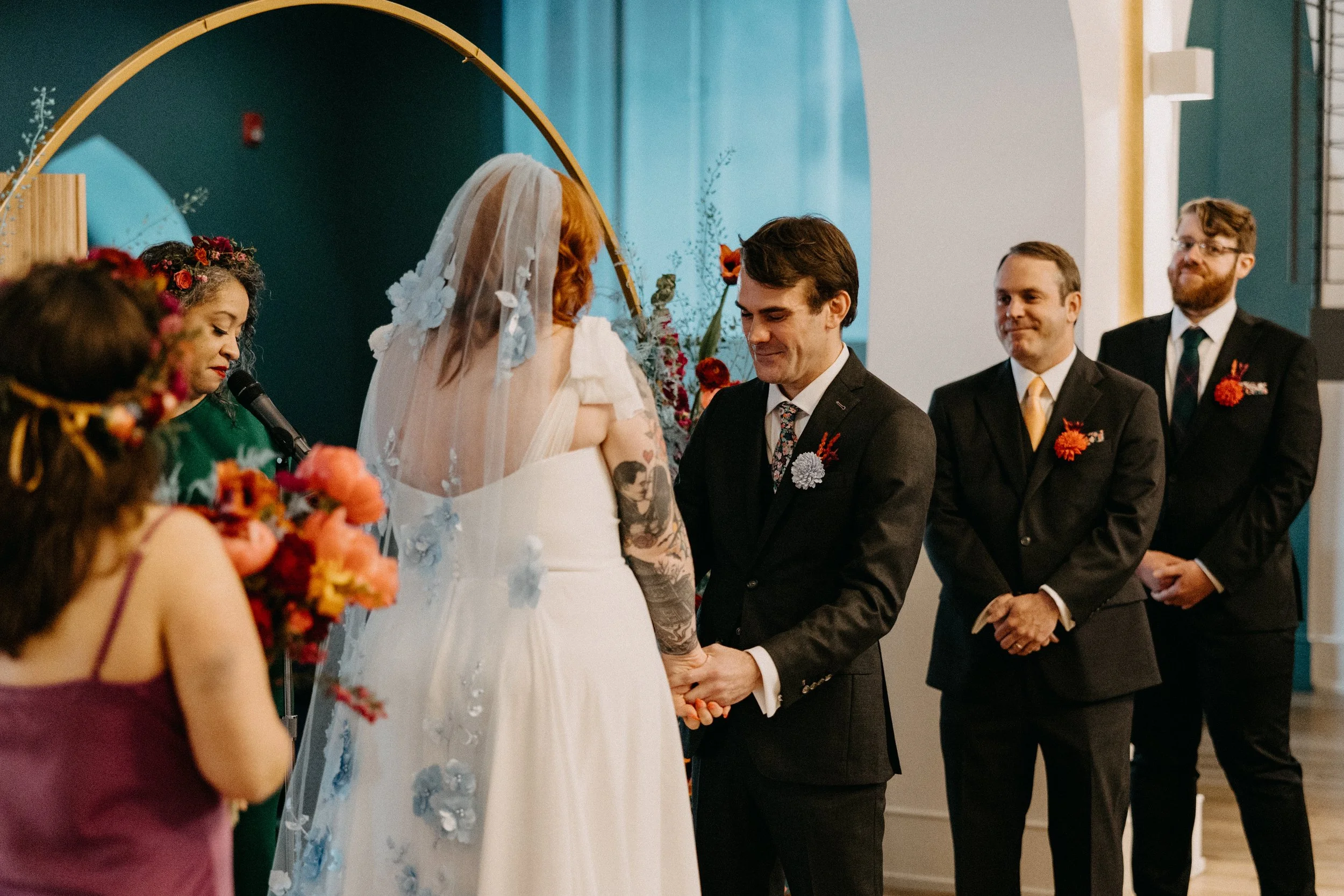 We also enlisted Salt Florist to create the dreamy, funky-yet-whimsical ceremony backdrop. We stuck with the teal in the color scheme as the main focus for this installation - we wanted it to match the accent wall behind the ceremony. Salt also created the must stunning, colorful bridal bouquet for Hannah.