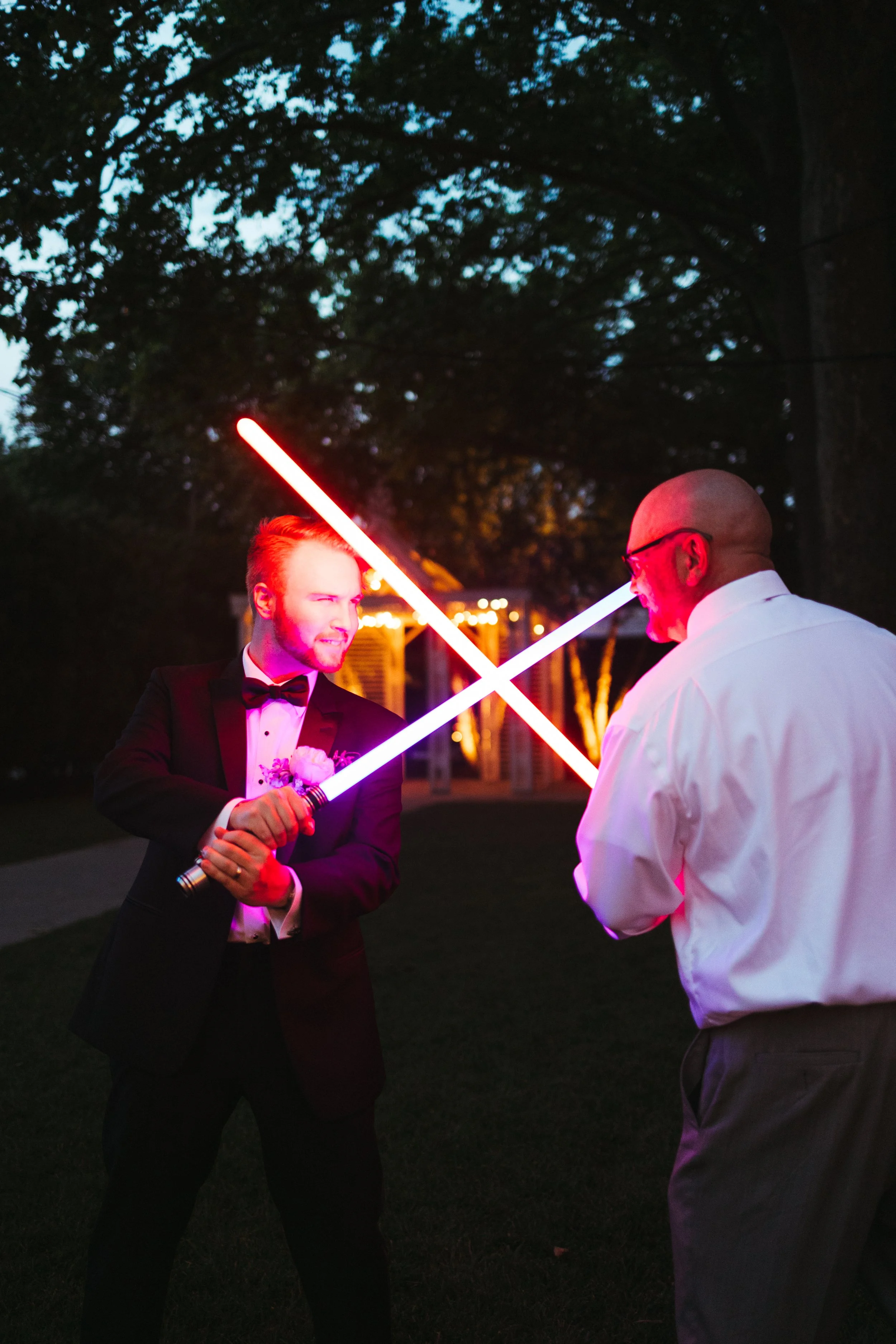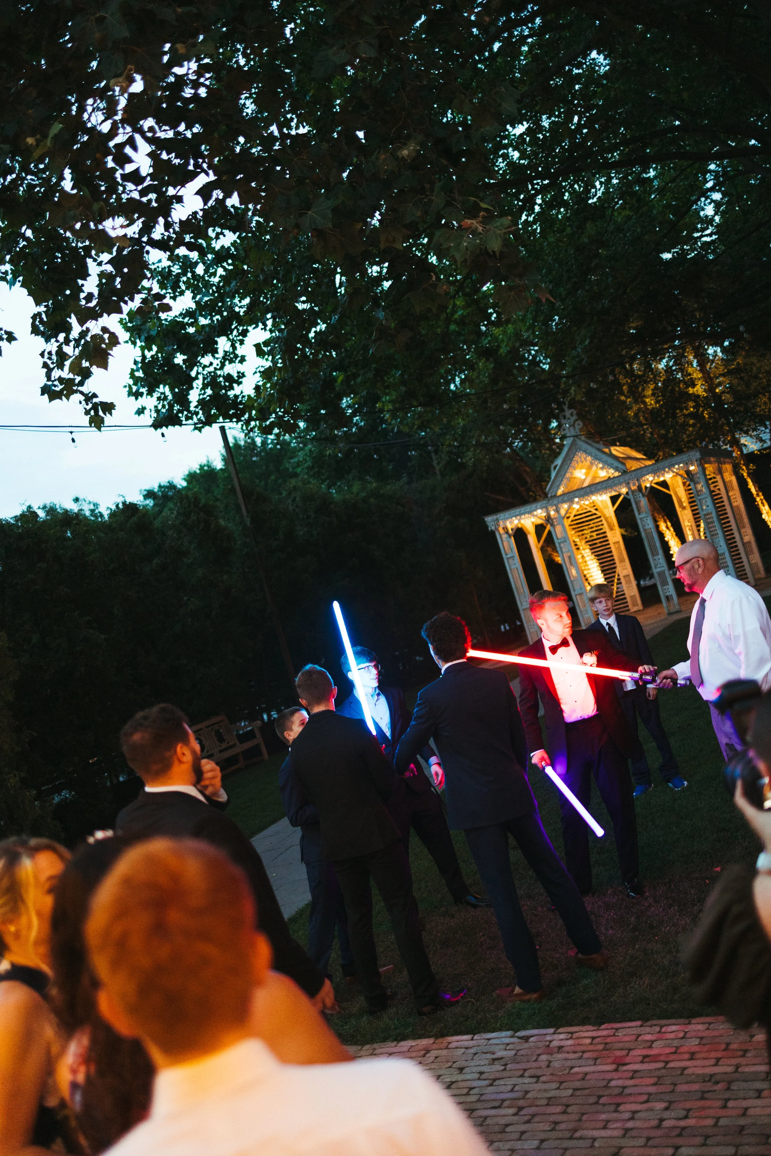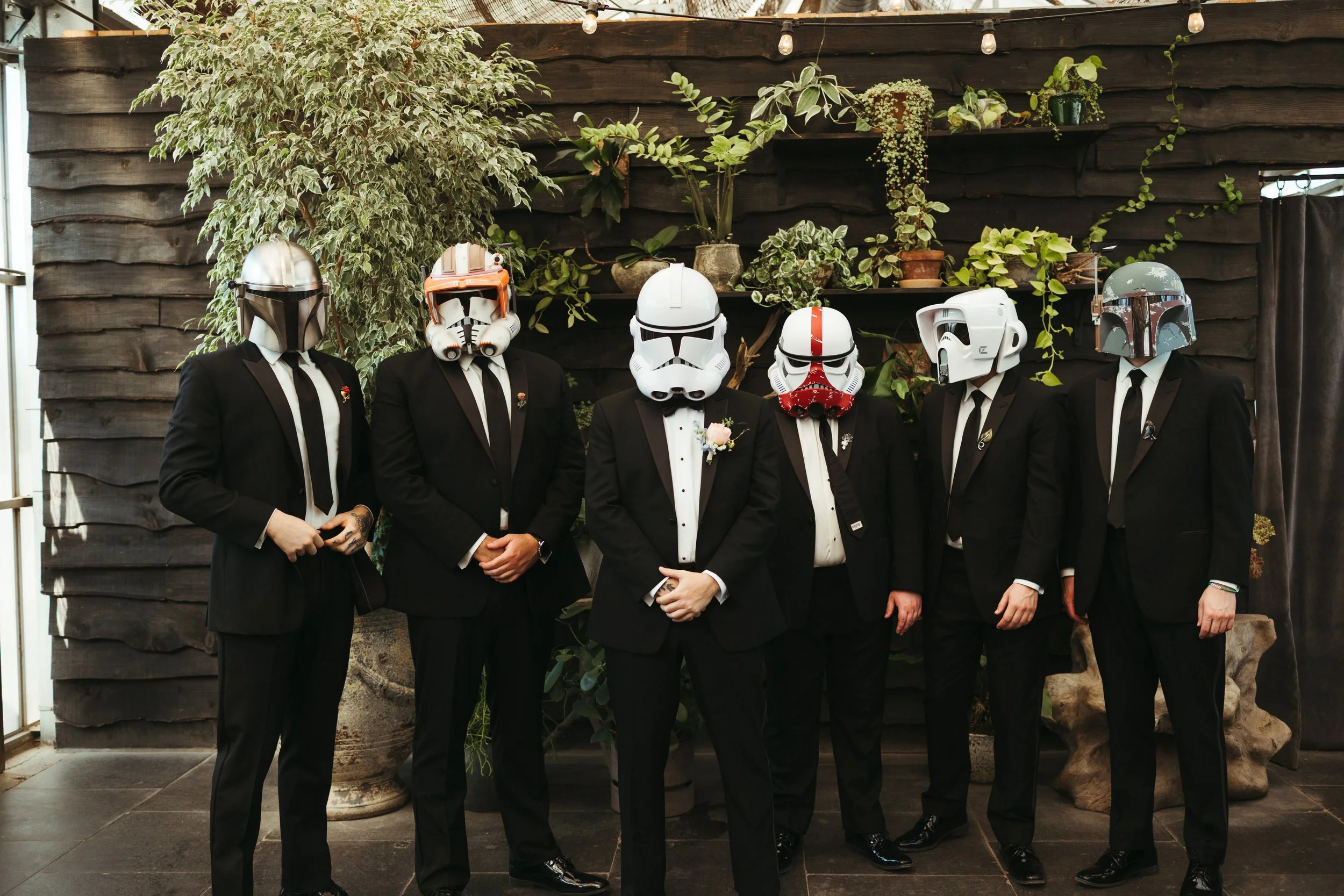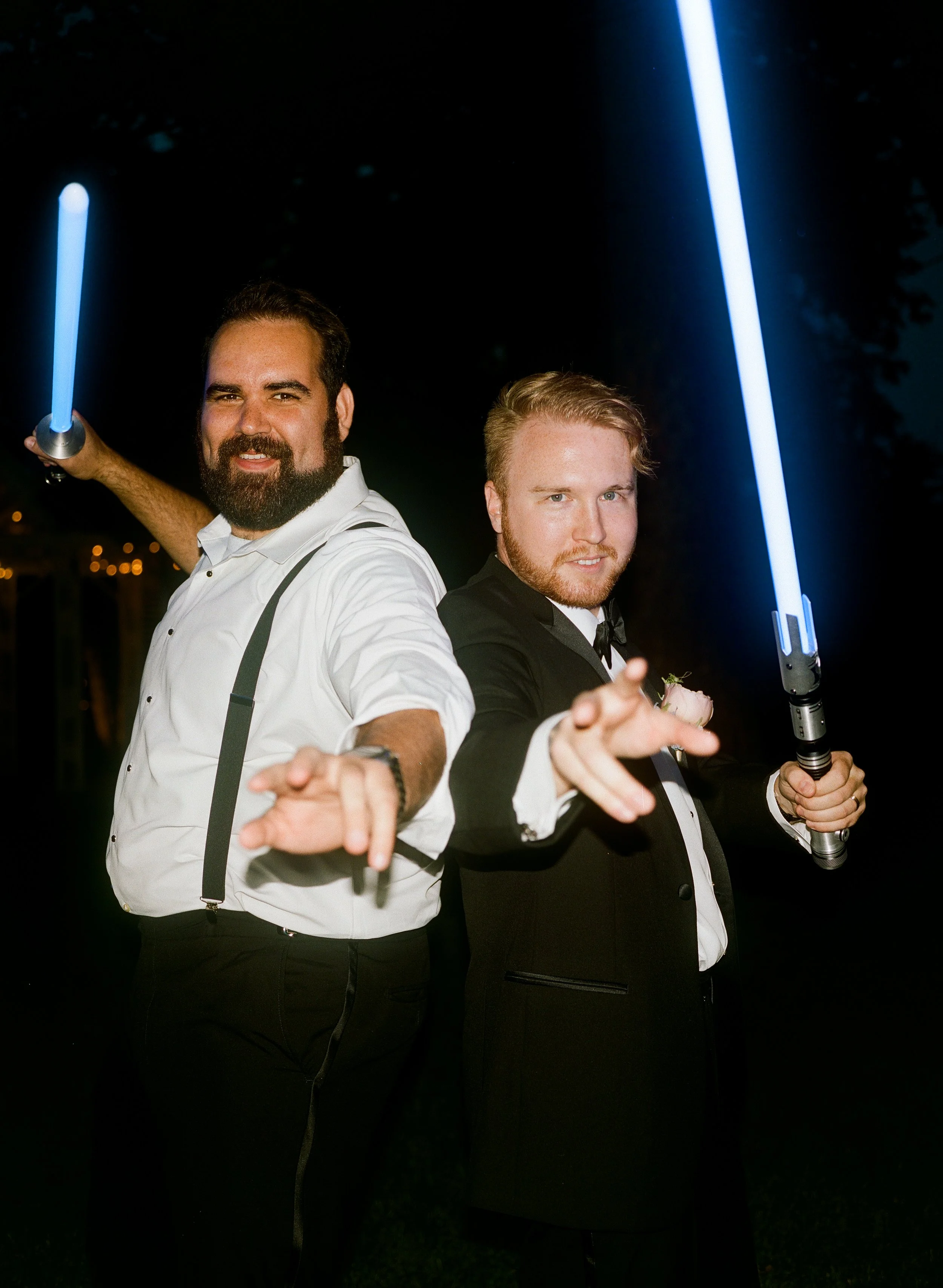 Katie & Tyler made sure their personalities were heavily incorporated into the day. Katie took their love of theater and made the ceremony programs as custom Playbills. As music lovers, they had Tyler’s guitar as a “guest book” for guests to sign. No Macarena spun pop punk tracks for the dance floor, reflecting the couple’s love of Emo Night. Of course, the most prevalent personalized touches were the nods to Star Wars. Tyler and his groomsmen each had move-quality Star Wars helmets and actual, working light sabers. Later in the night, Katie & Tyler posed with the light sabers for a photo op, which turned into guests having light saber duels under the summer stars.