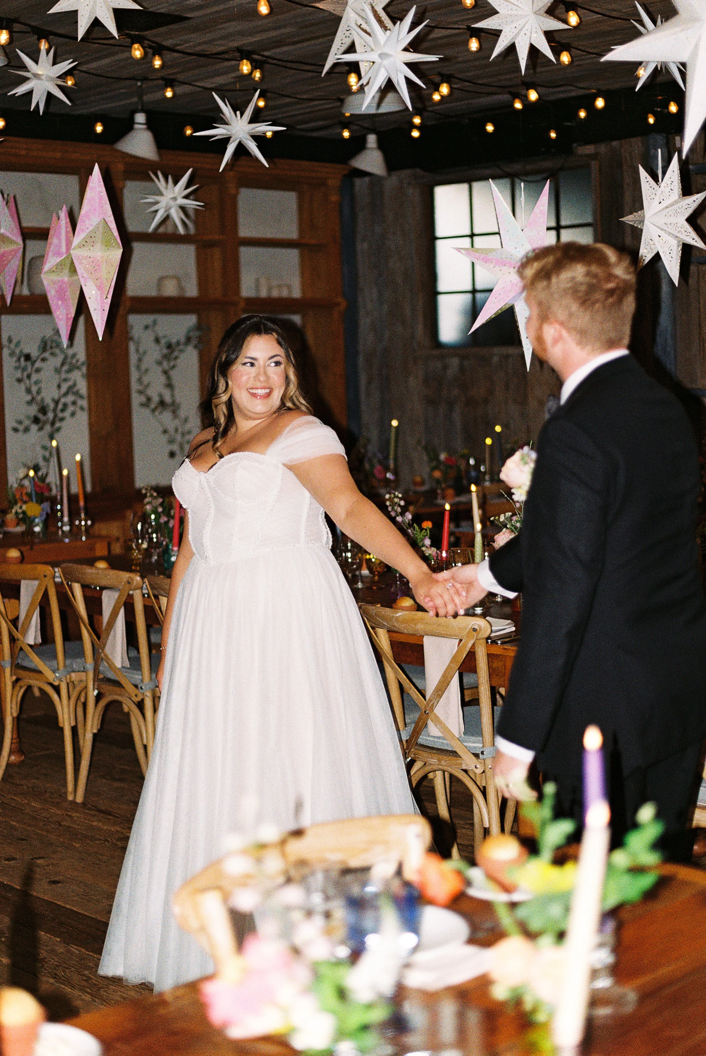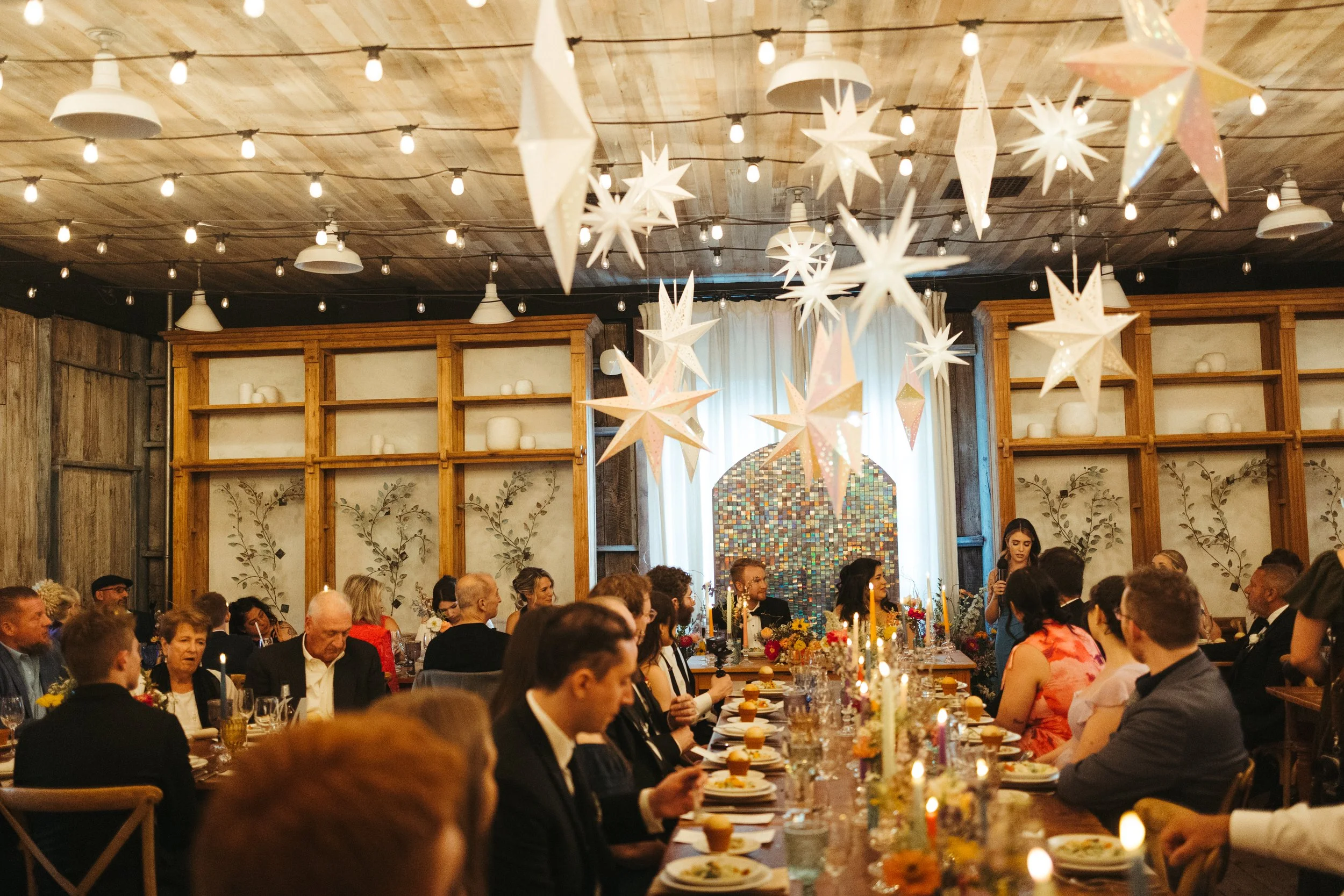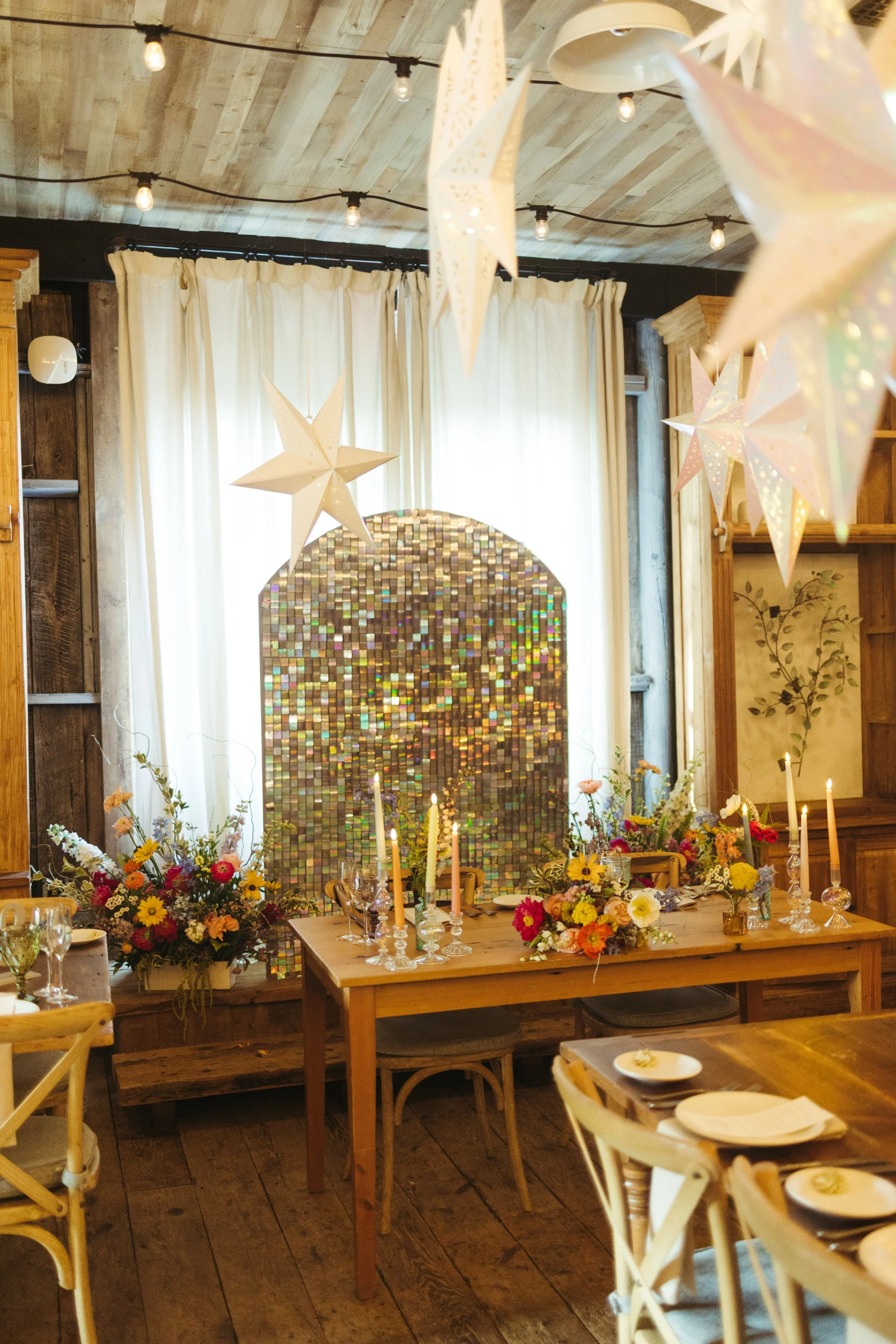 Of course, one of the main *stars* of the day was the paper lantern installation in the main dining space. Creamery Hill worked their magic and brought Katie’s magic celestial vision to life, creating a dreamy ceiling full of varied iridescent star lanterns. They even twinkled to add an especially ethereal effect.