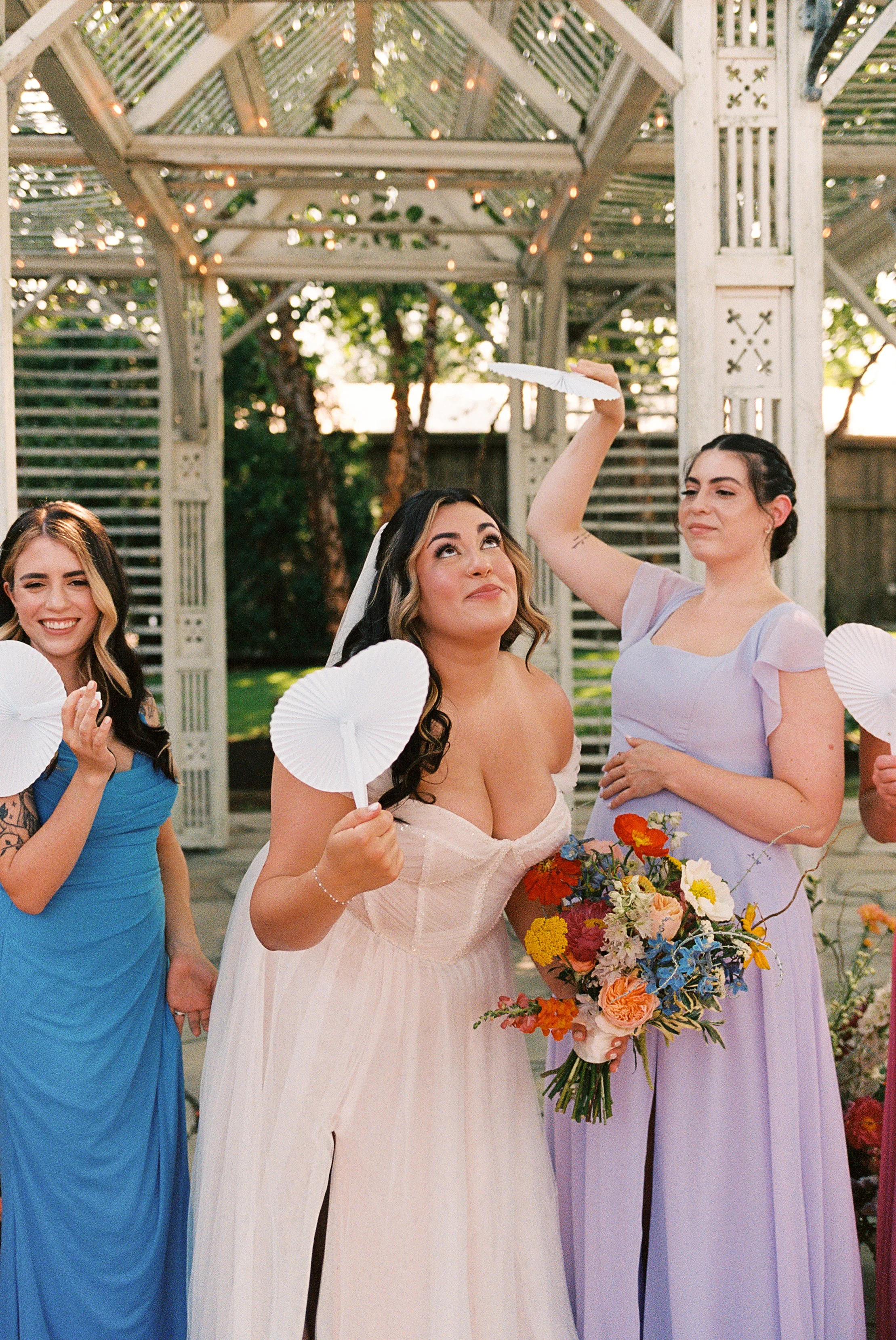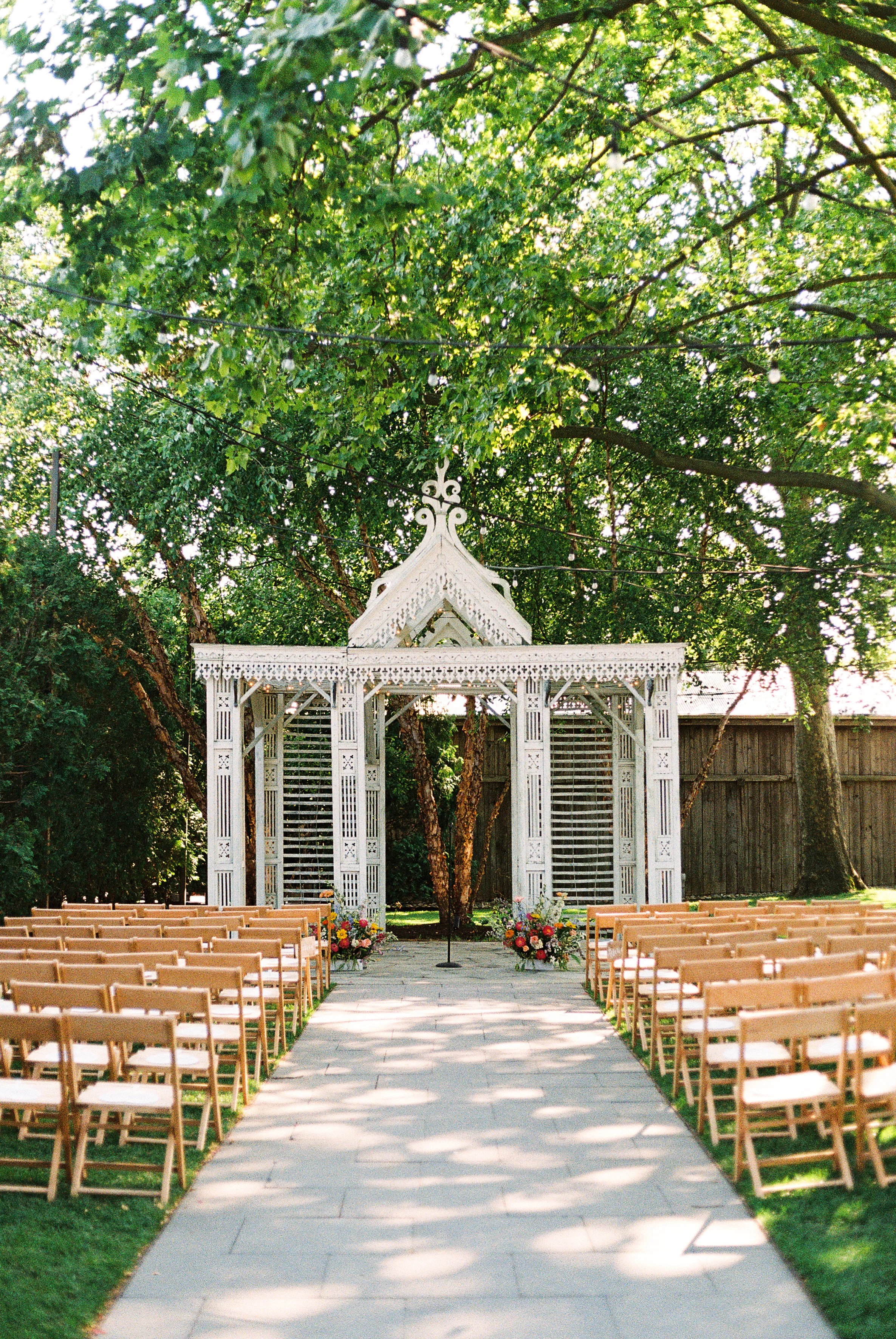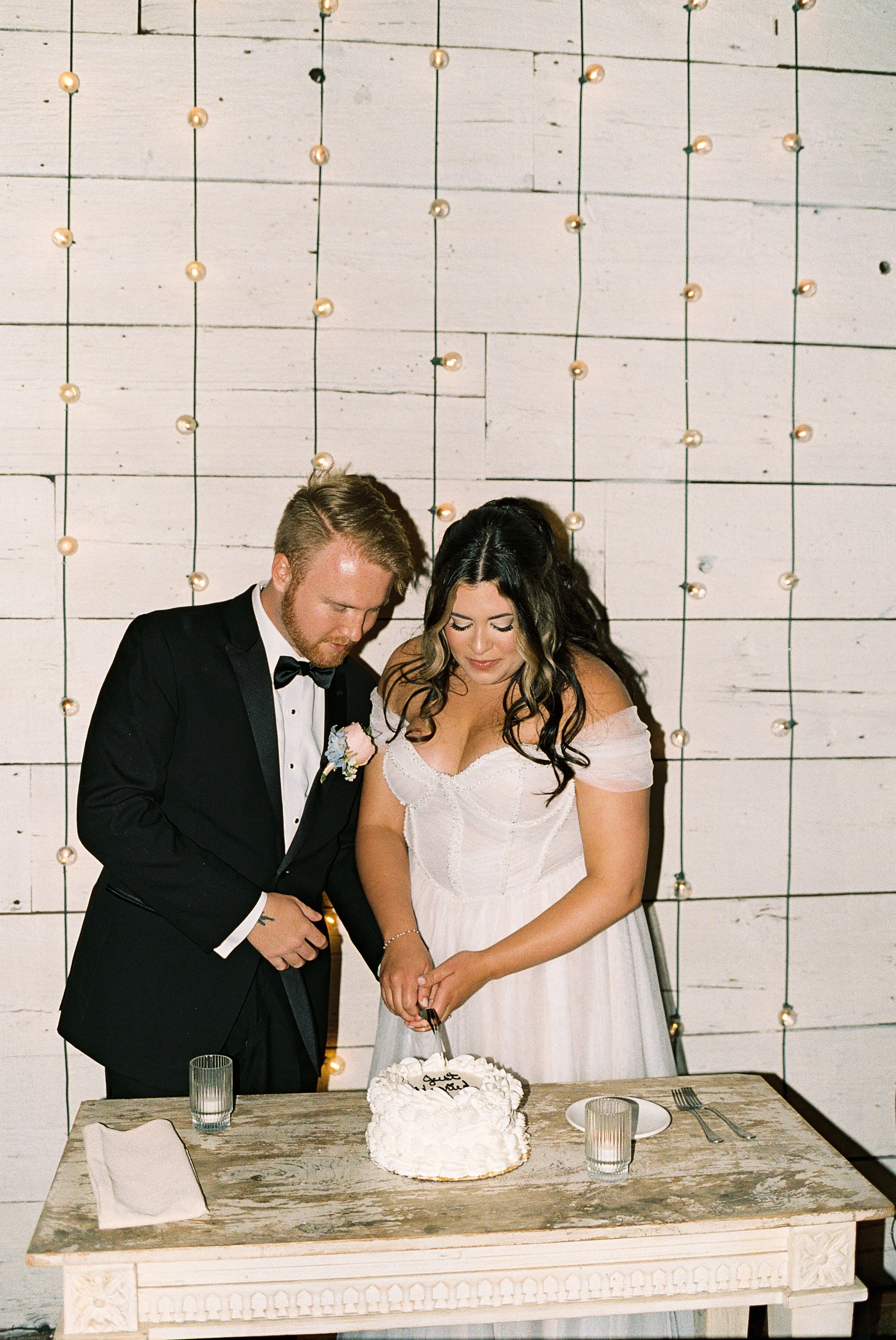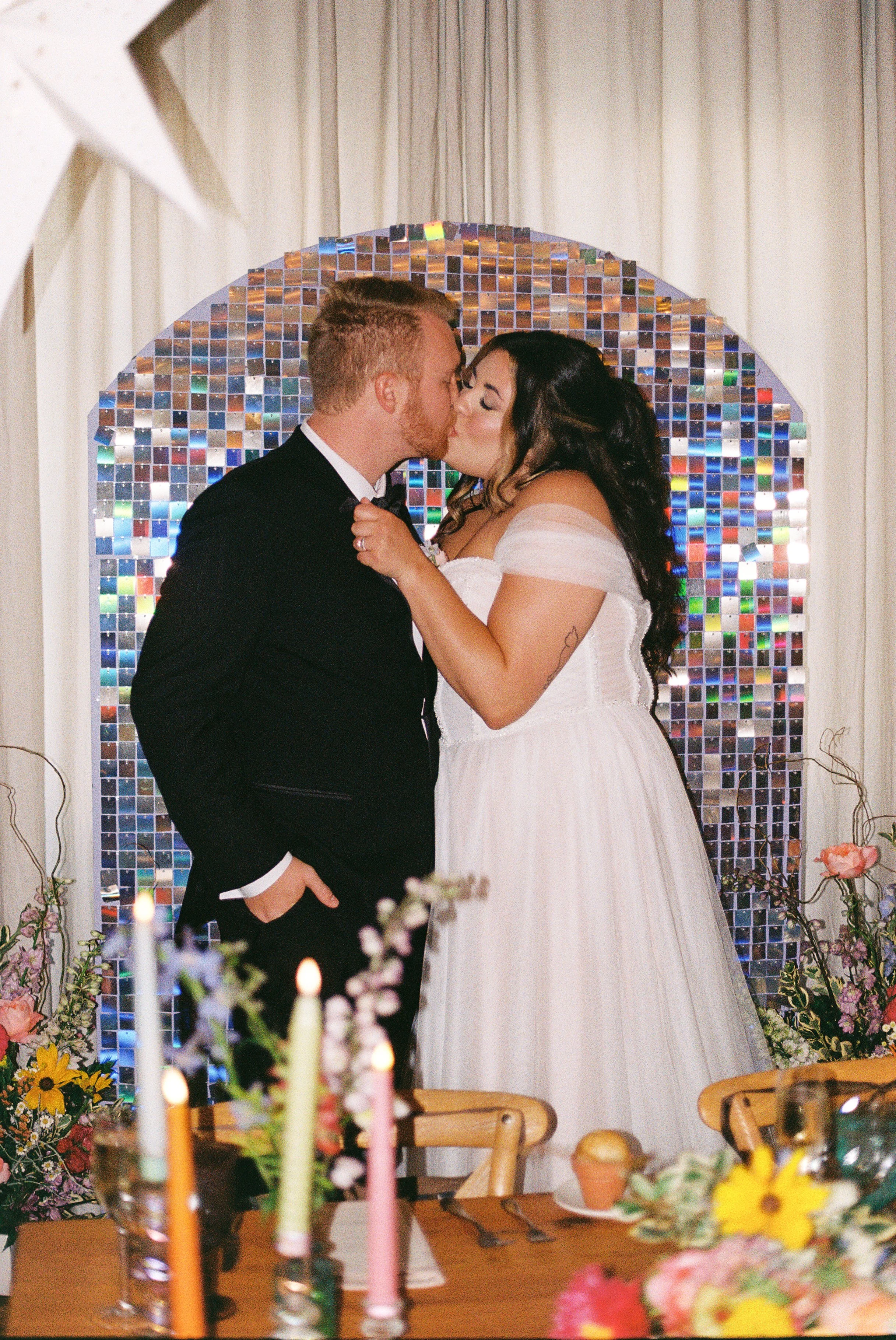 Katie came across this styled shoot that we did a few years ago and immediately knew these were the vibes she wanted to bring to her and Tyler’s wedding. Naturally, she hired the amazing photographer from the shoot, Tori Sokalski. Tori specializes in retro, nostalgic film and digital photography, which was perfect for the aesthetics of this day. Another thing Katie fell in love with from the shoot was the ceremony backdrop. We had that custom-made by our friends at Creamery Hill for the shoot, so we arranged for that exact Bespoke piece to serve as Katie and Tyler’s sweetheart table backdrop.