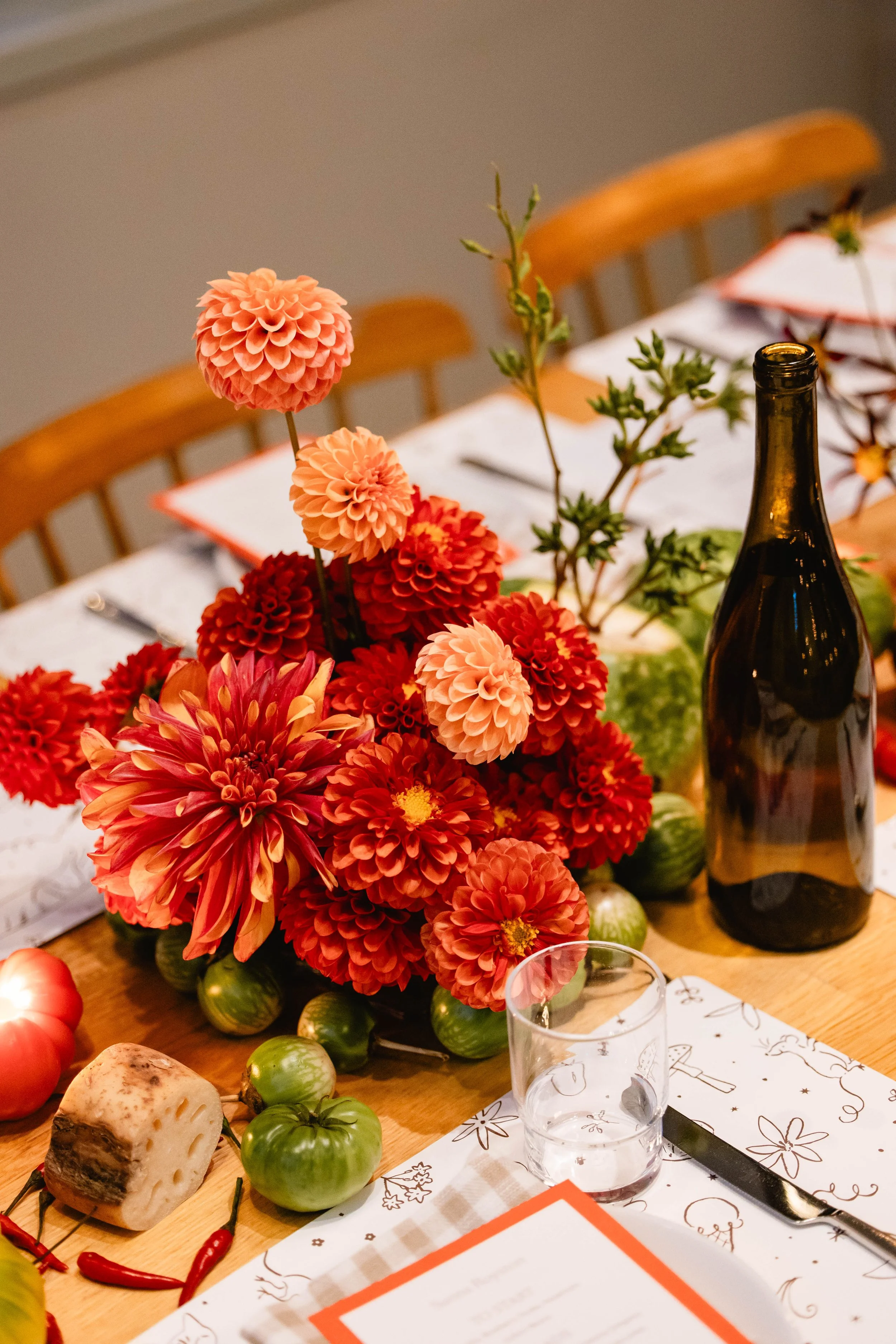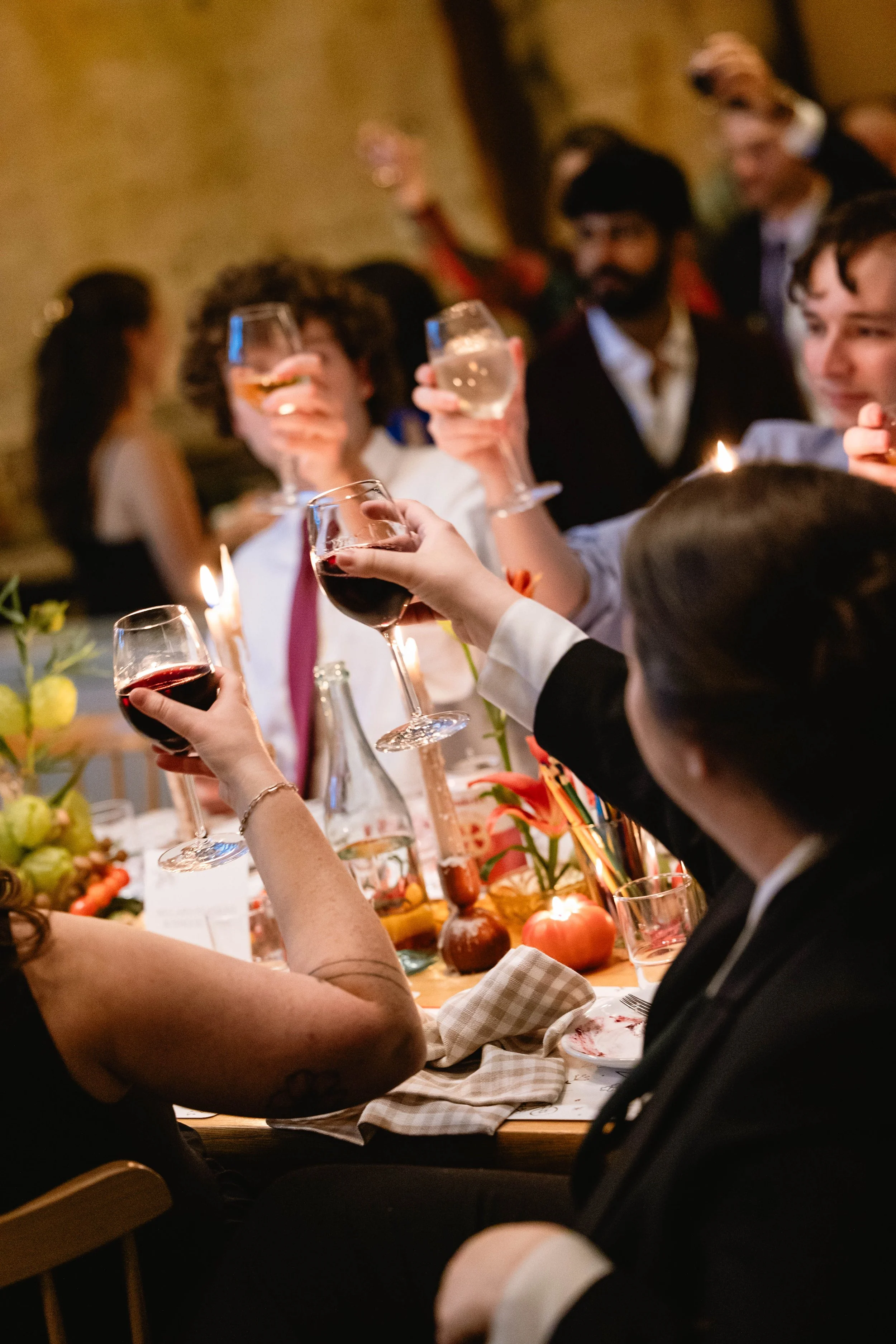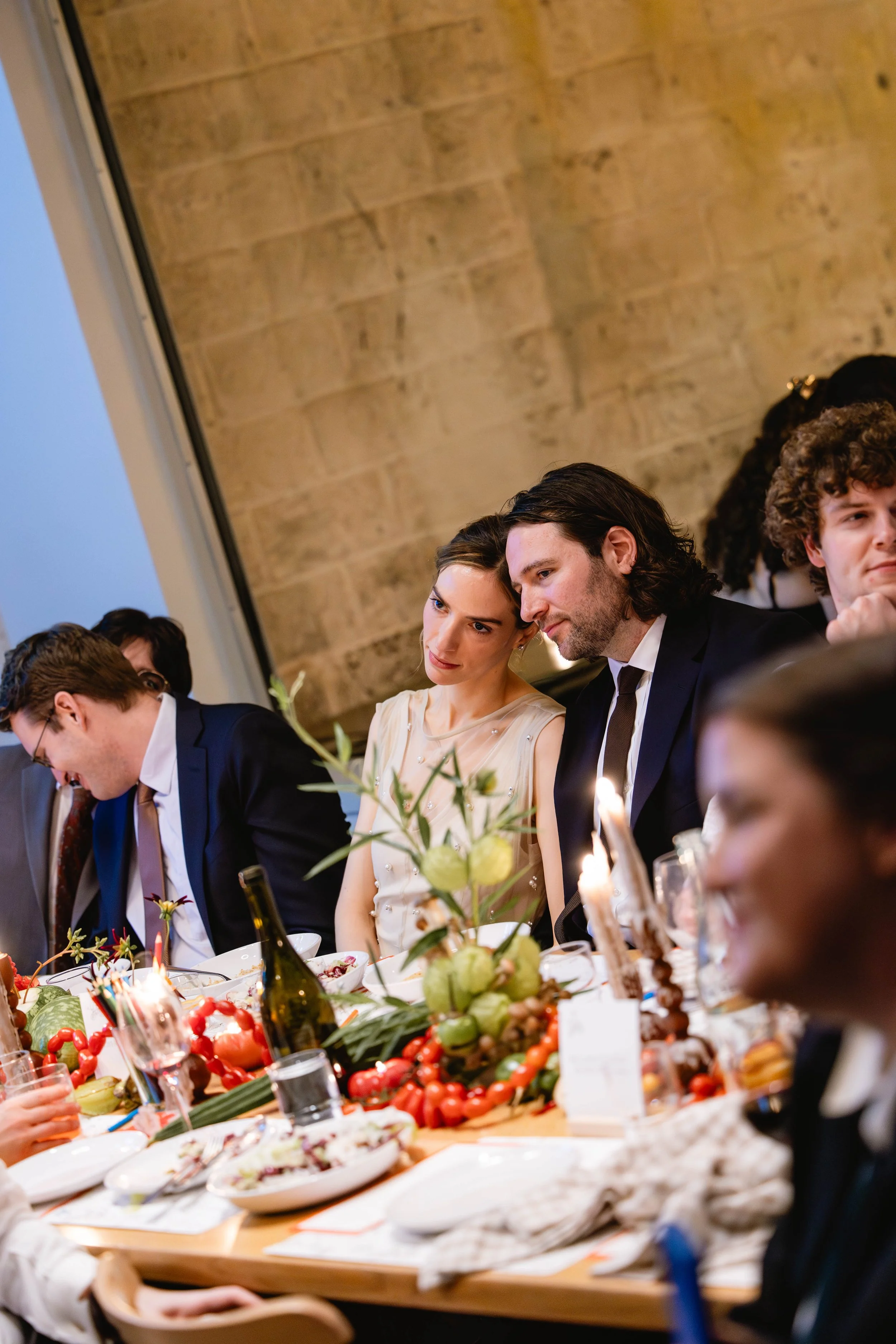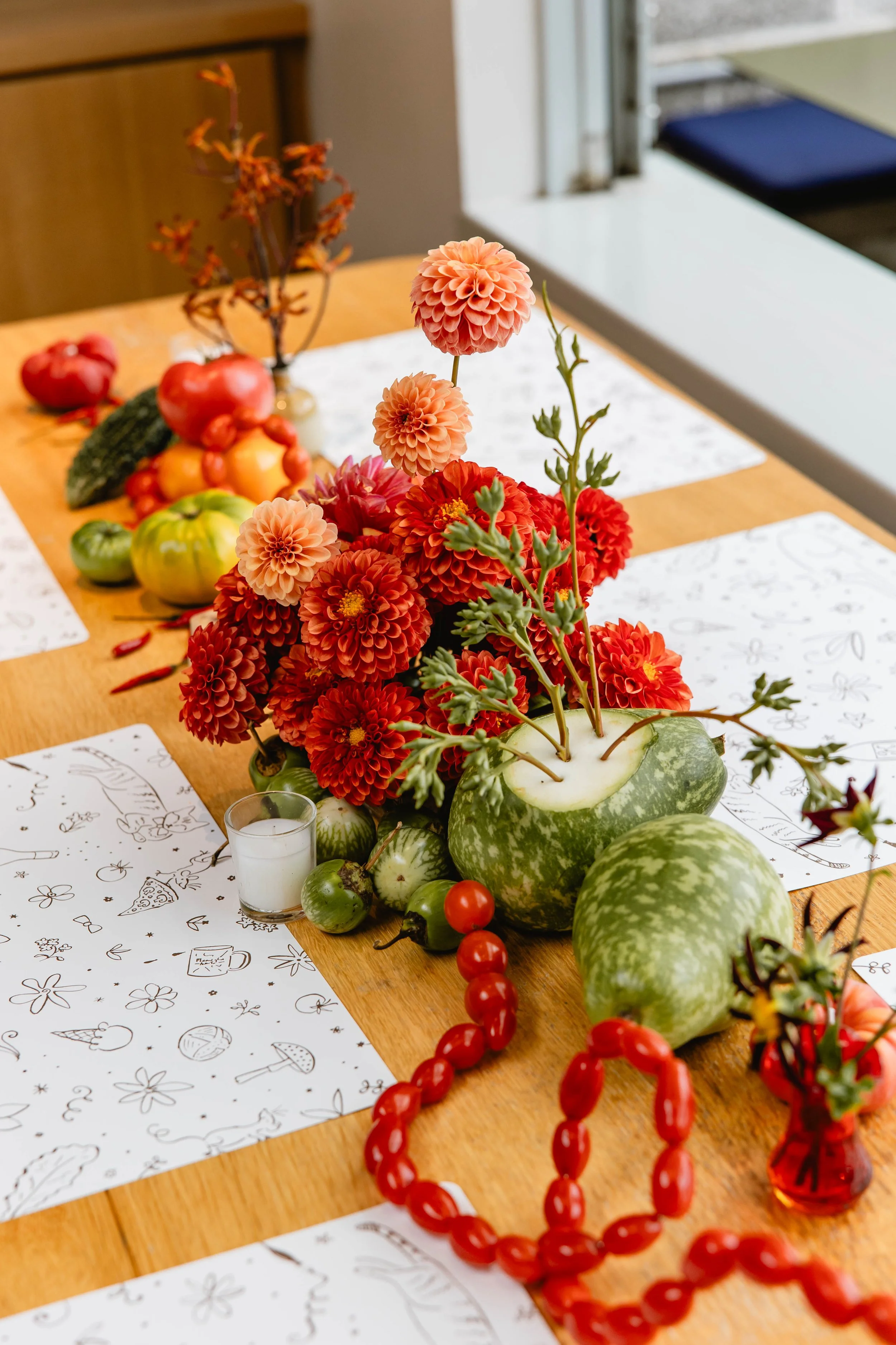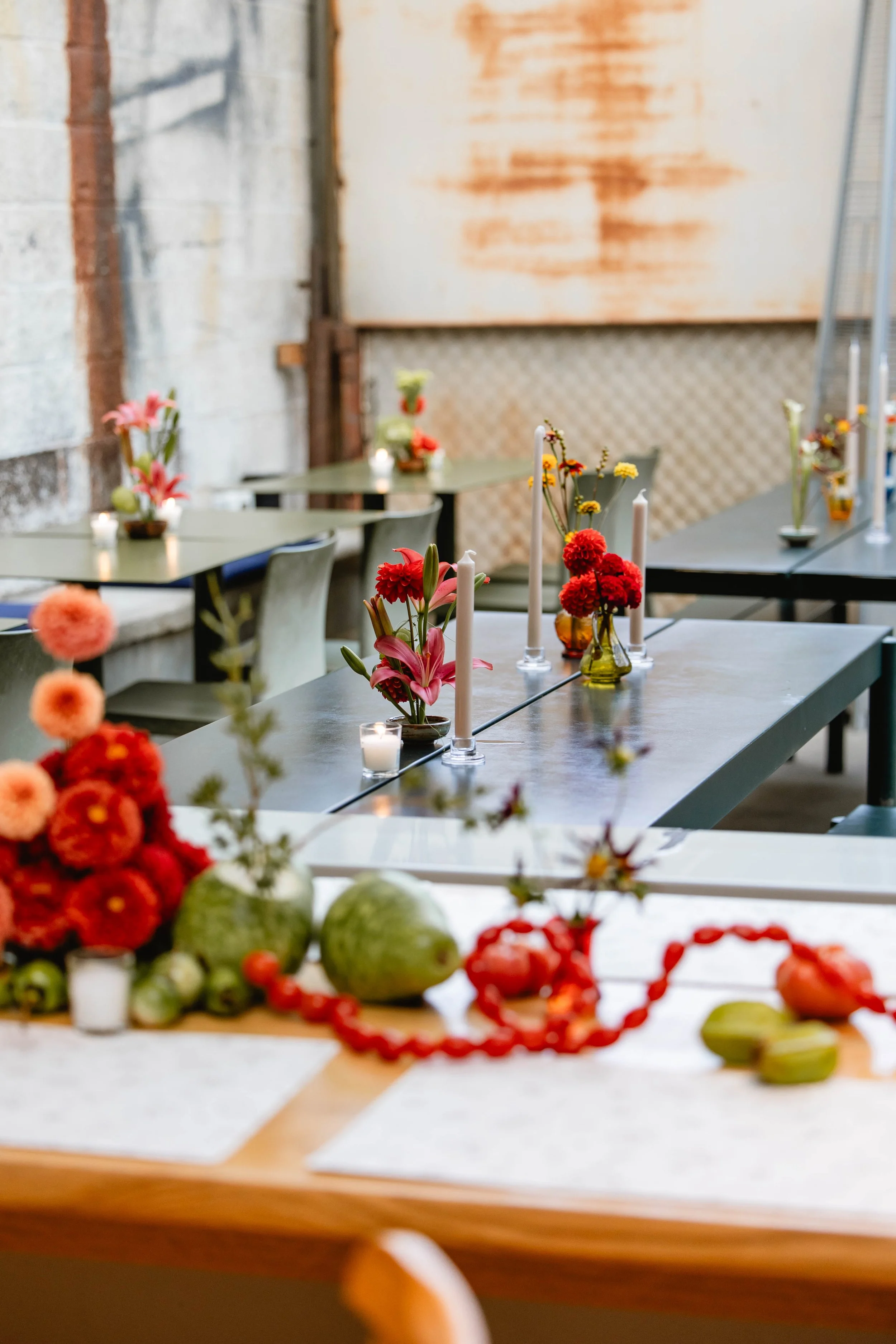 We carried this cutesy, whimsical, Italian dinner party aesthetic into the reception. Salt Floral really took this vision and ran with it - think flowers mixed with sculptural and thoughtfully-placed tomatoes, mushrooms, melons, grapes, and other fun culinary delights as the centerpieces. We found realistic-looking tomato candles and of course had to have Kirby incorporate these into her tablescape. We brought in specialty checkered napkins from Nuage, which added to the trattoria vibe.