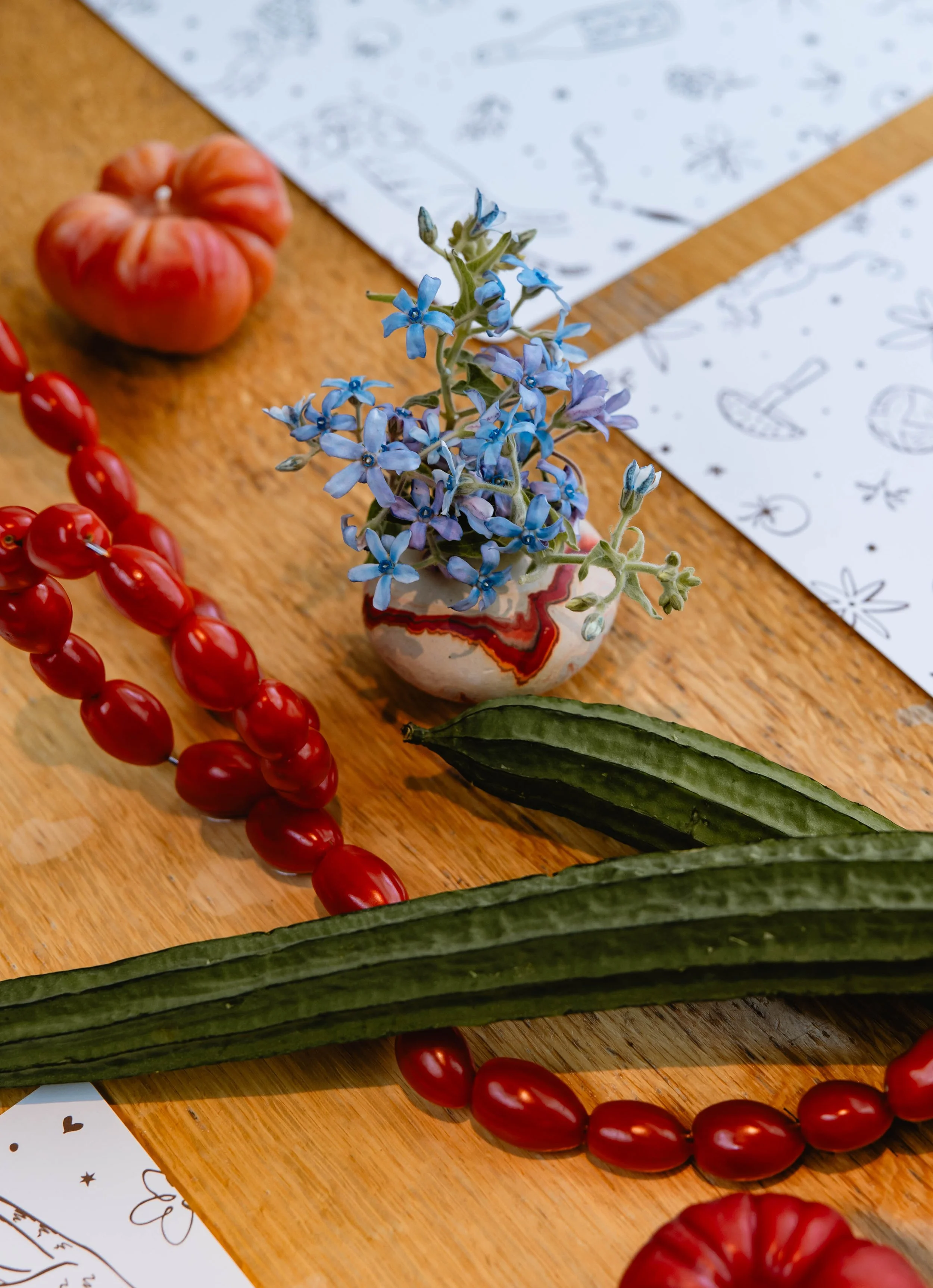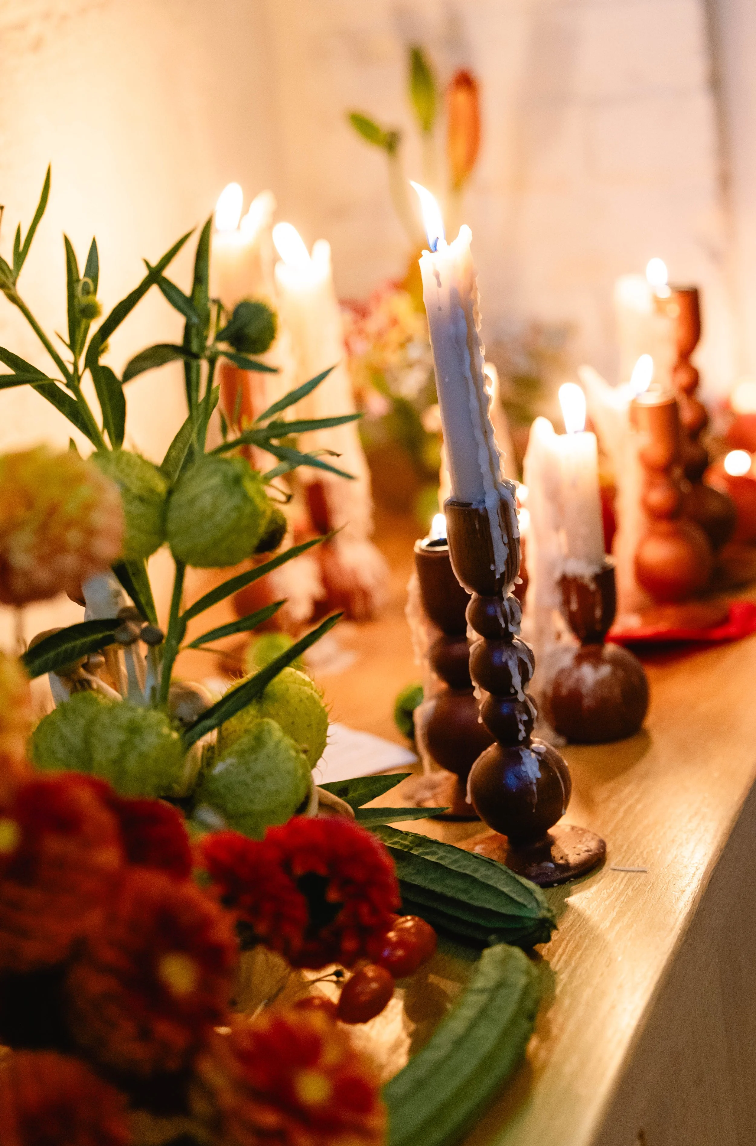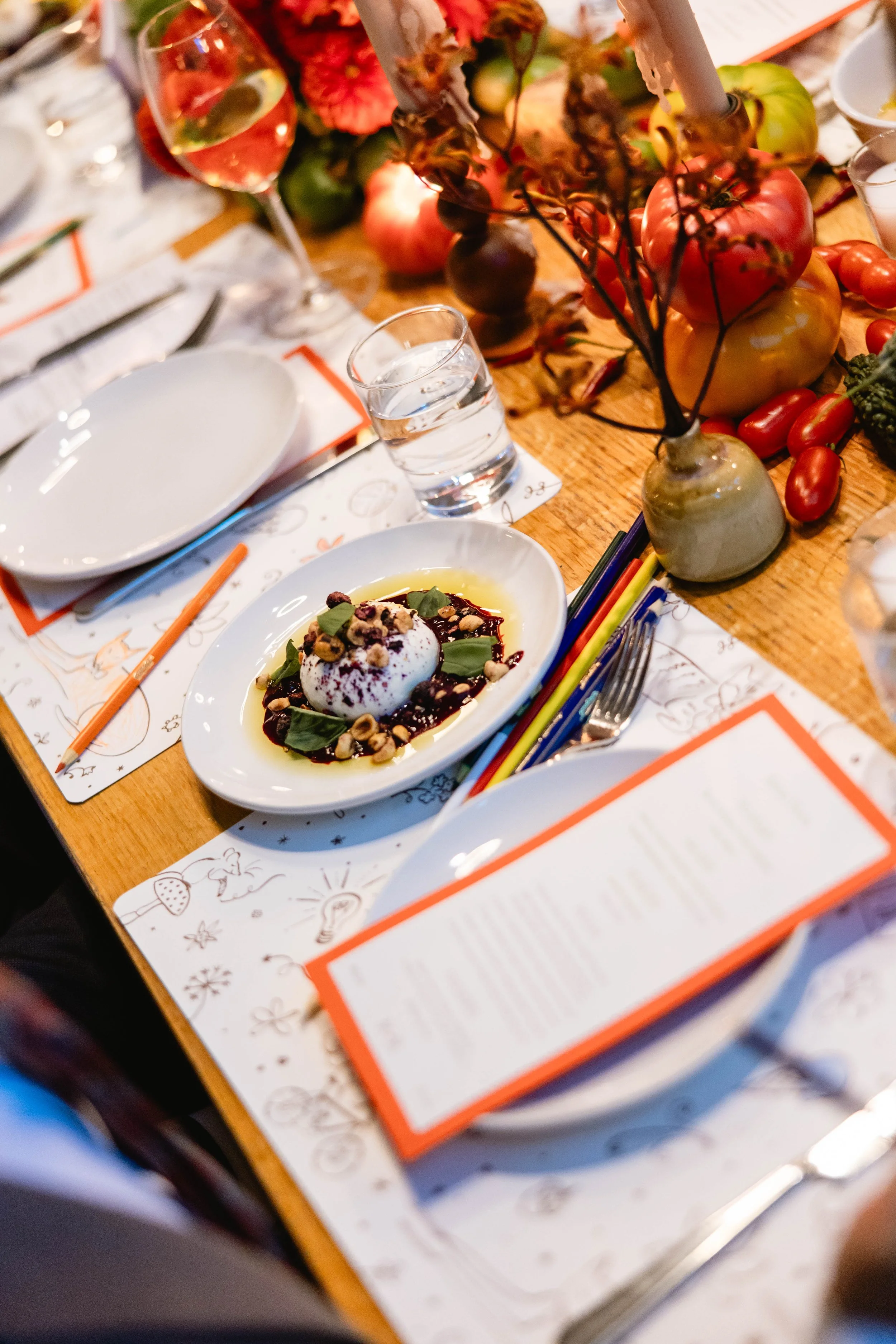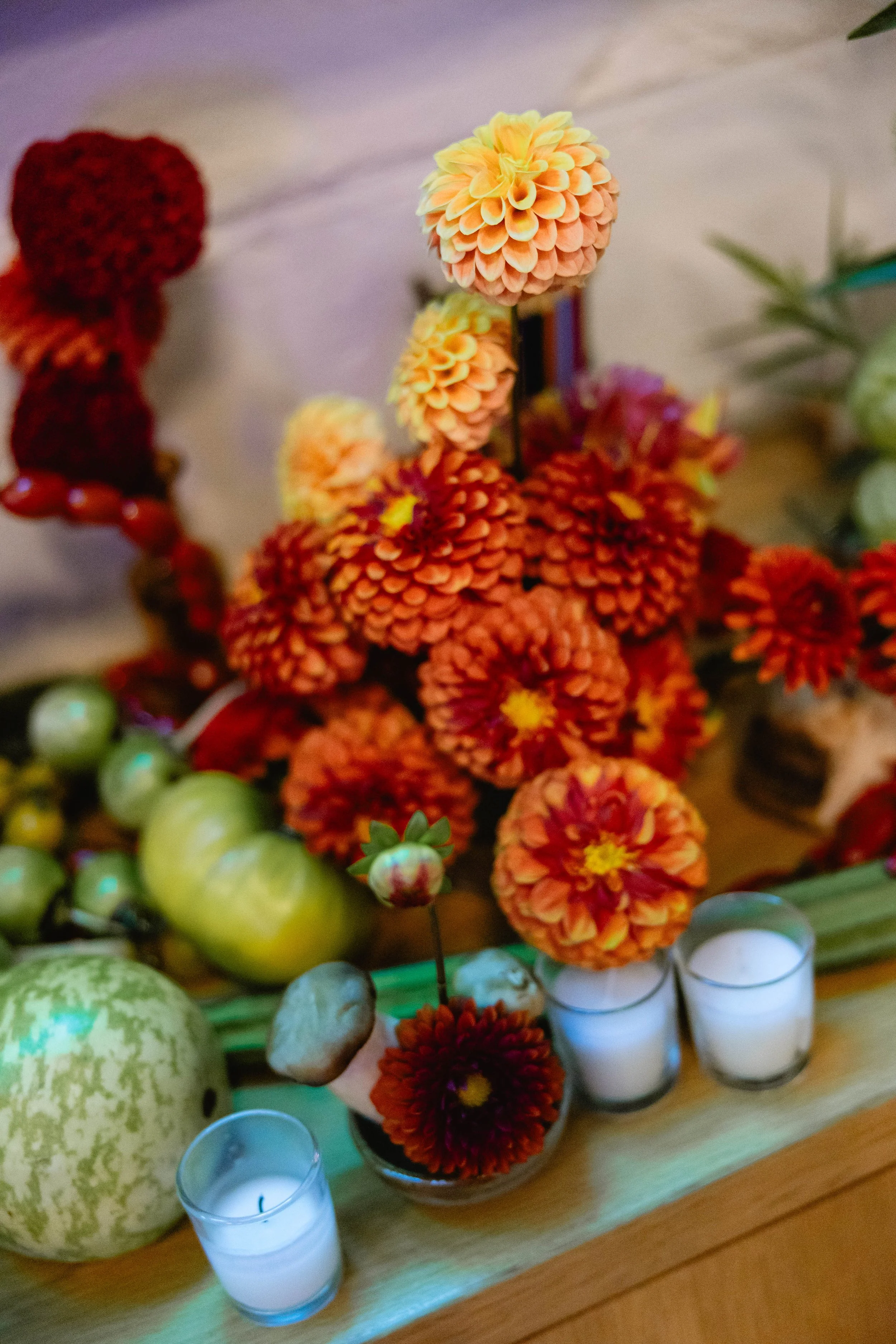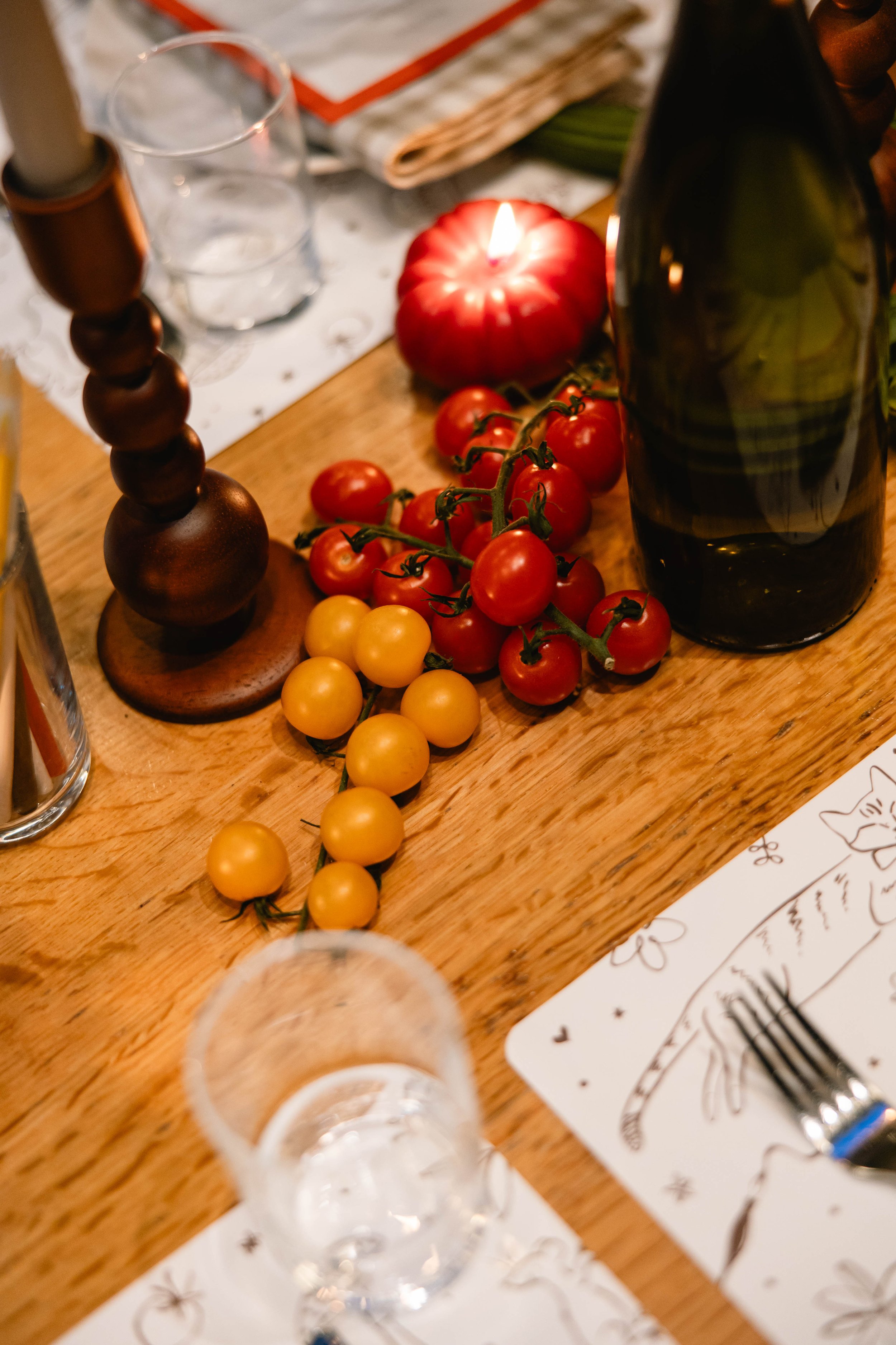 We carried this cutesy, whimsical, Italian dinner party aesthetic into the reception. Salt Floral really took this vision and ran with it - think flowers mixed with sculptural and thoughtfully-placed tomatoes, mushrooms, melons, grapes, and other fun culinary delights as the centerpieces. We found realistic-looking tomato candles and of course had to have Kirby incorporate these into her tablescape. We brought in specialty checkered napkins from Nuage, which added to the trattoria vibe.