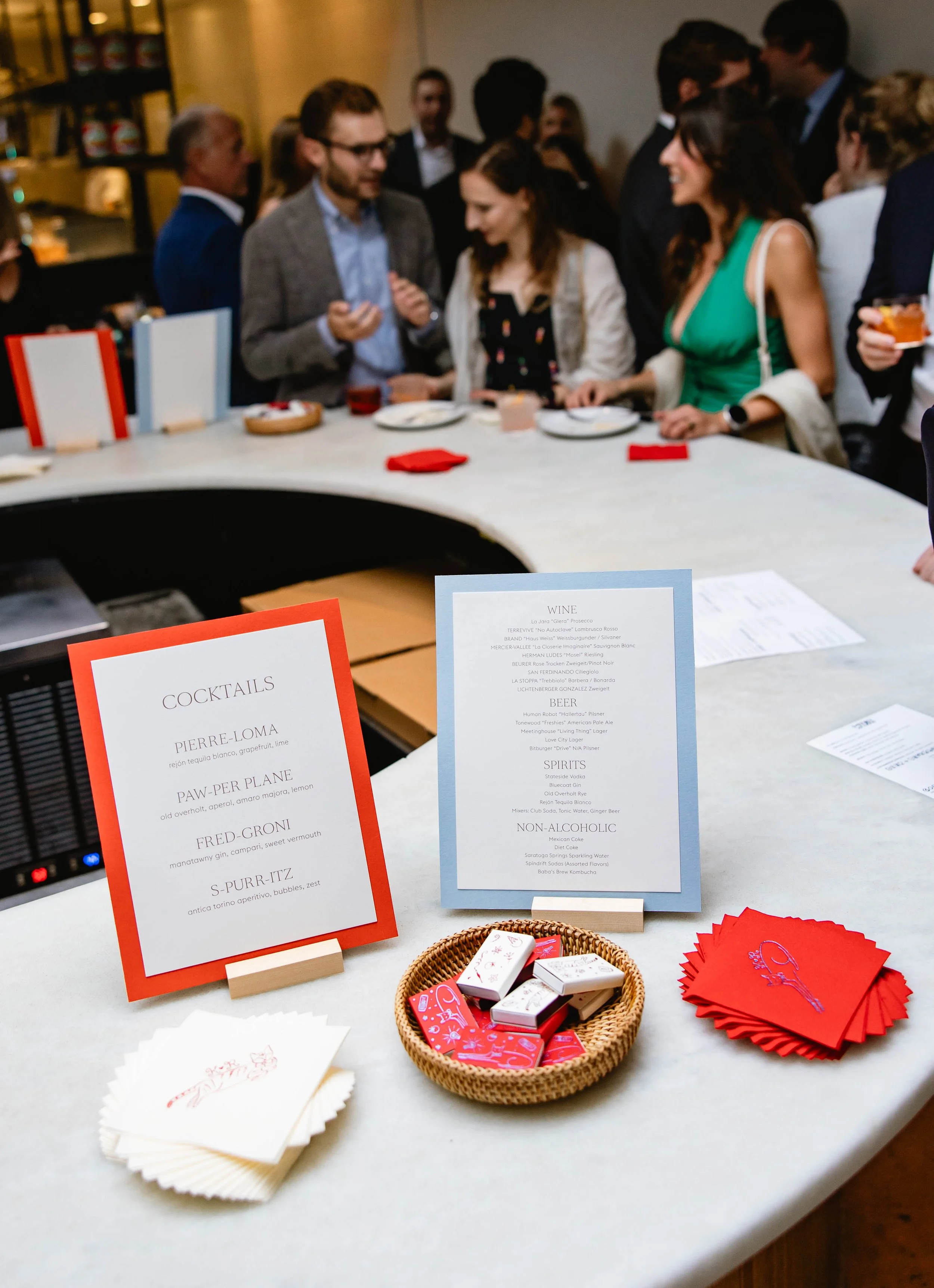 Kirby and Ryan’s vision was a lot like Kirby’s art - whimsical, playful, fun, sentimental, and bespoke. Of course, Kirby illustrated and designed all of the branded elements, including the wedding website, save-the-dates, and invitations, plus custom matchbooks, cocktail napkins, menus, and seating chart. The vibe throughout these items was romantic Italian dinner party meets cutesy personalized details (hello hand-drawn illustrations of their beloved cats).