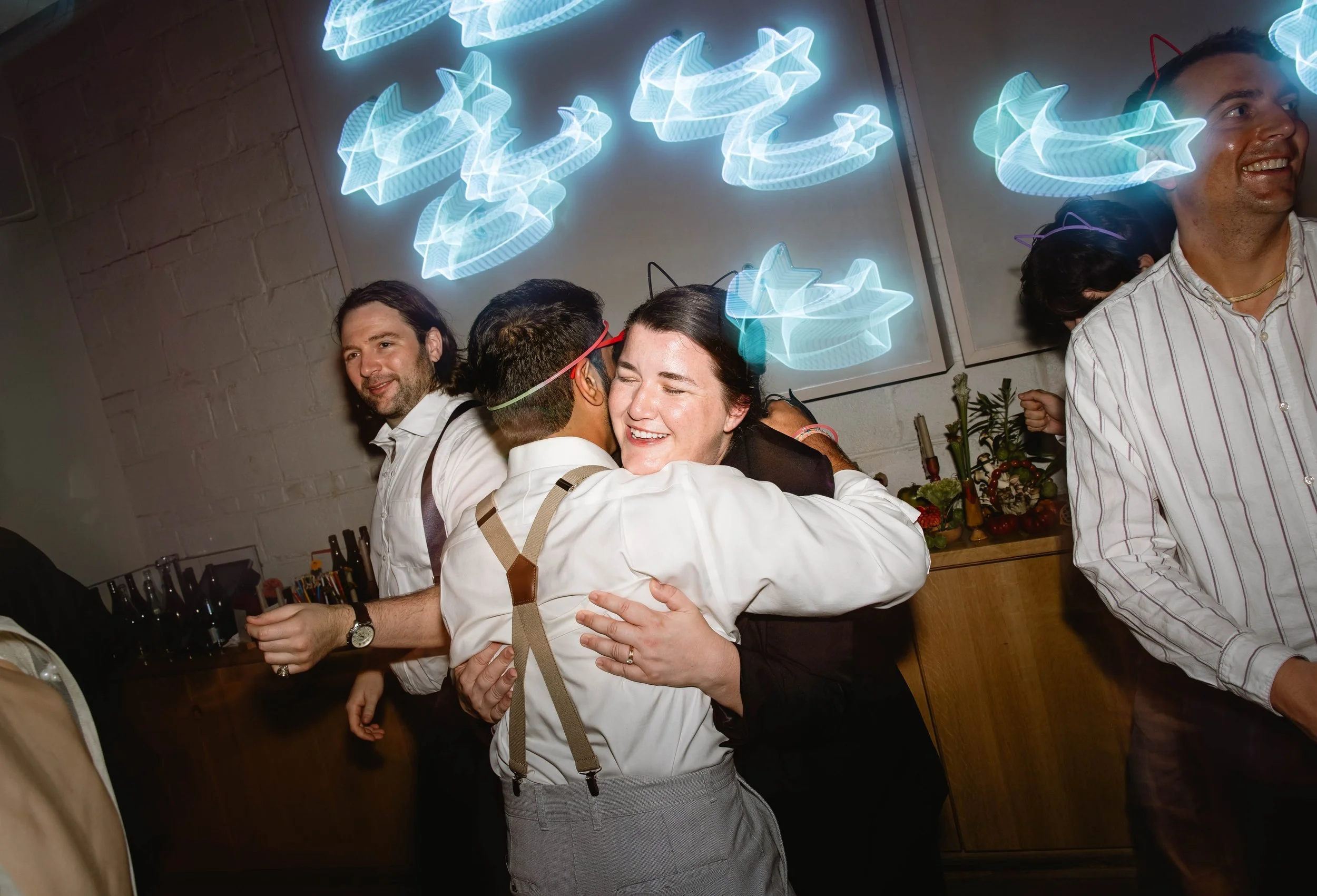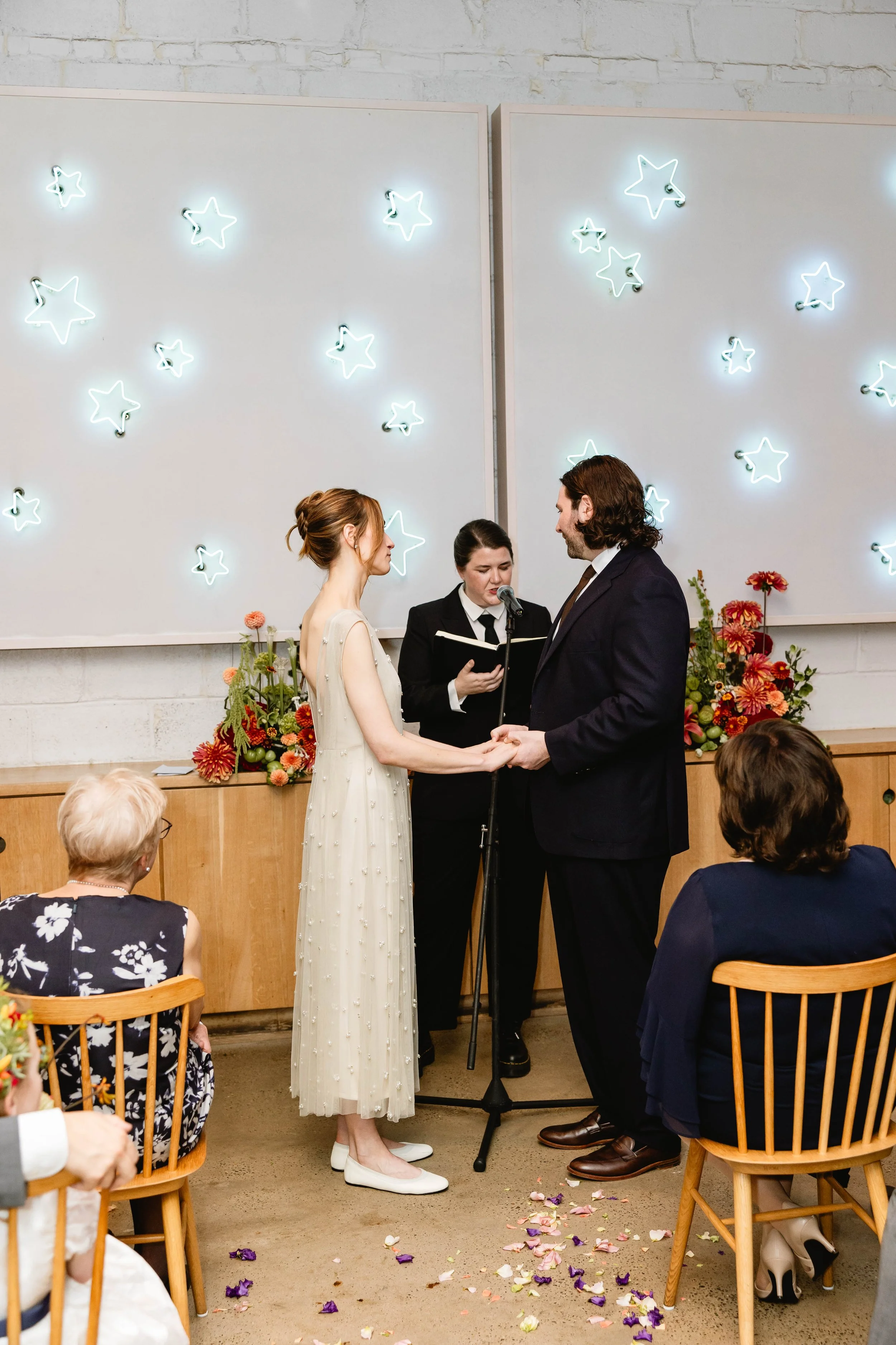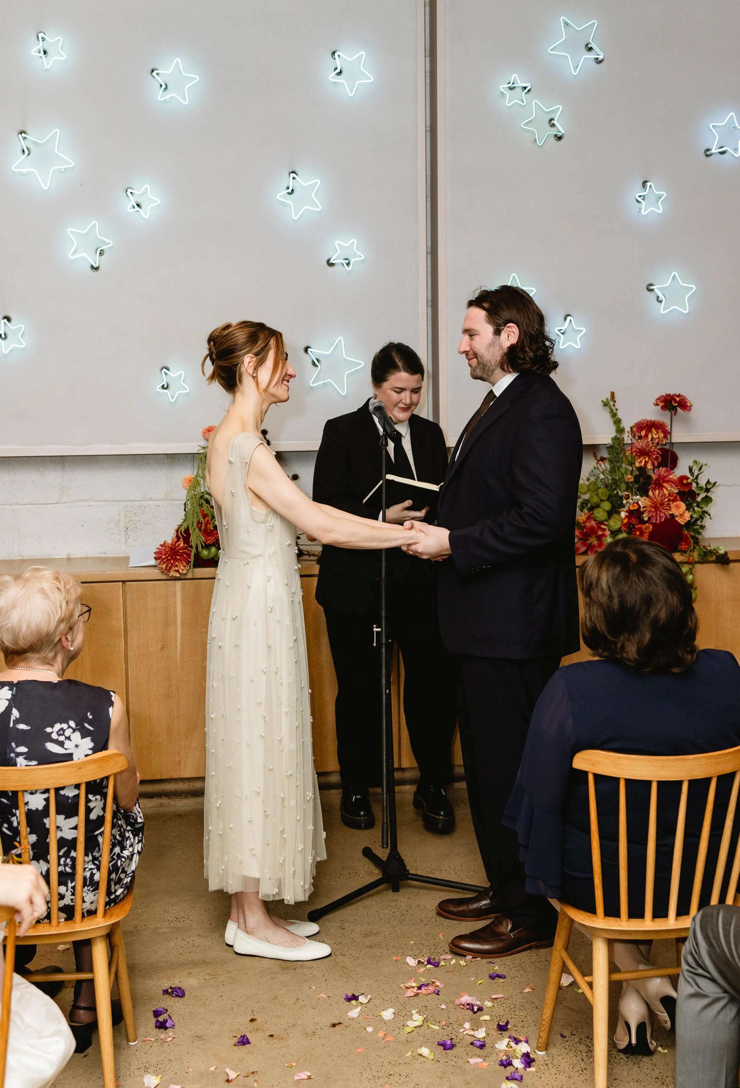 Pizzeria Beddia provided the most special, fun, and unique setting. Kirby and Ryan said their vows in front of the “star wall”, adorned with neon star lights, and above the bar was the famous smiley cloud chandelier. Guests enjoyed cocktail hour on the outdoor terrace and bar area, while we flipped the ceremony space for dinner. After dinner, we transformed the space again, clearing the tables to form the dance floor for an epic party.