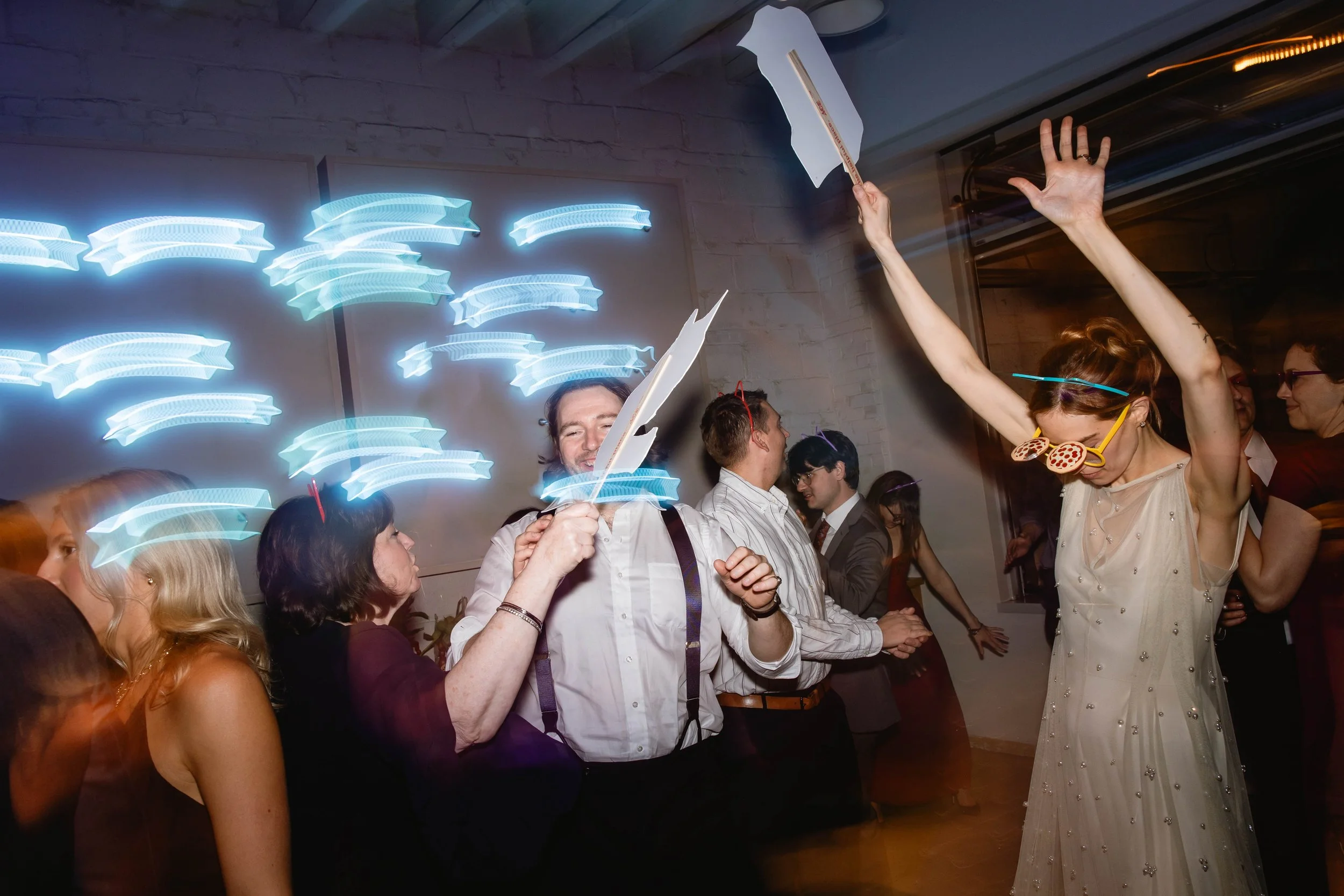 Of course, “catcessories” aka lifesize cutouts of their cats and cat-ear headbands were provided for guests to rock on the dance floor. These were accompanied by funky sunglasses, which included pairs that featured mini pizzas. A dance party based on pizza and cats? Count us in.