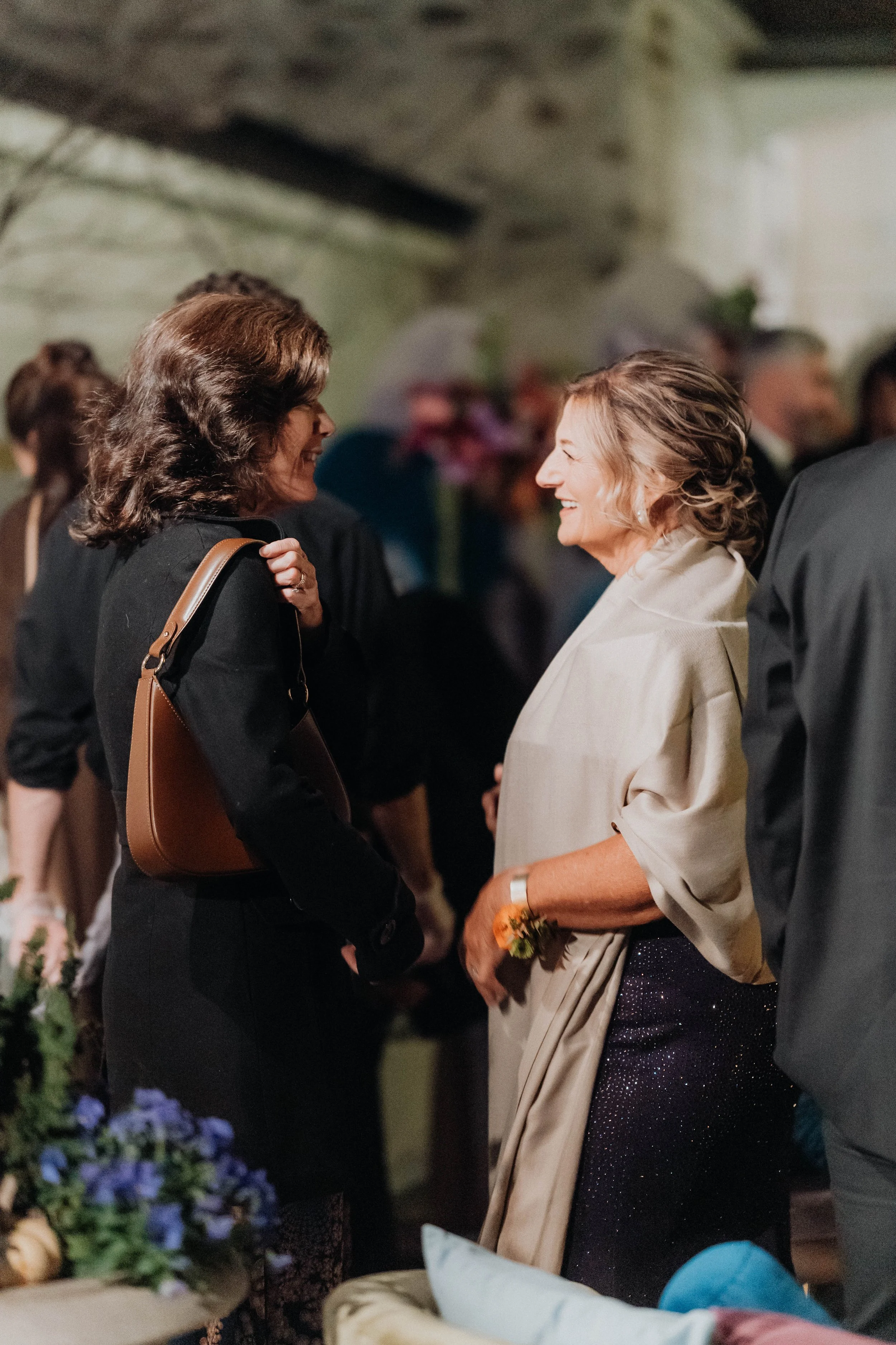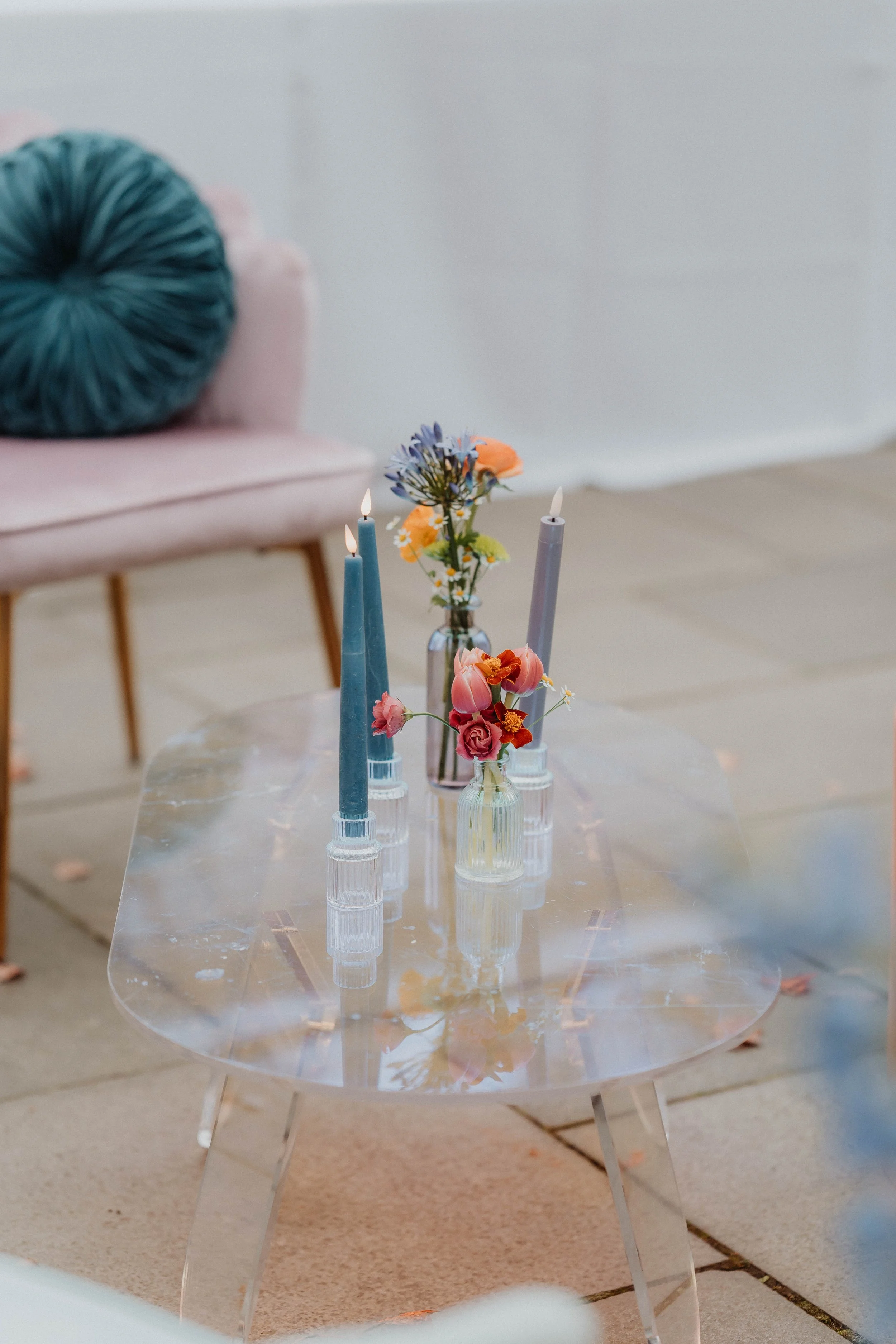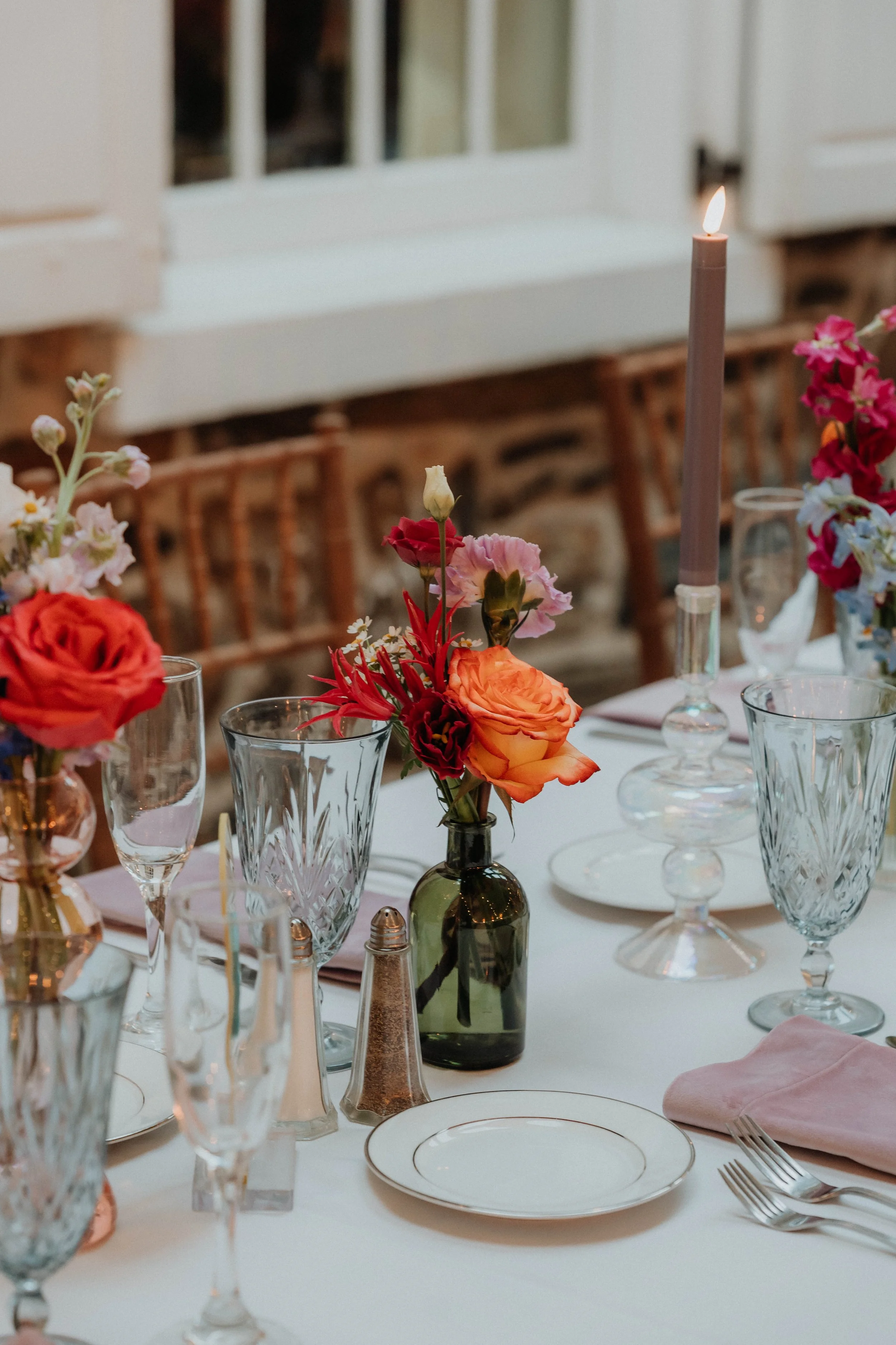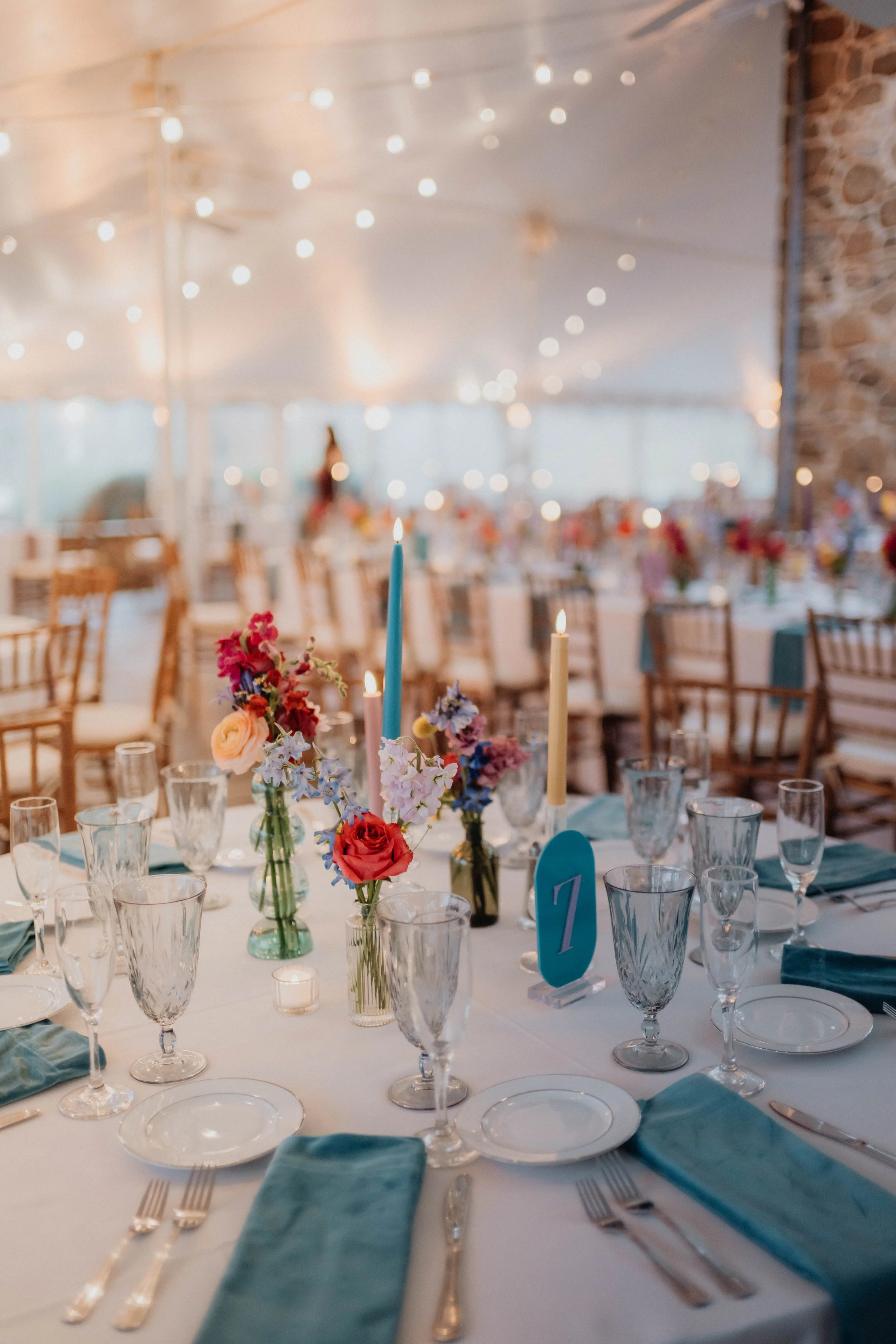 To incorporate the palette even more, we brought in specialty jewel-toned napkins from Nuage designs and blue glassware from Citrine Tablescapes. Kelsey at Creamery Hill provided iridescent candle holders that picked up and reflected all of the colors in the tablescape.