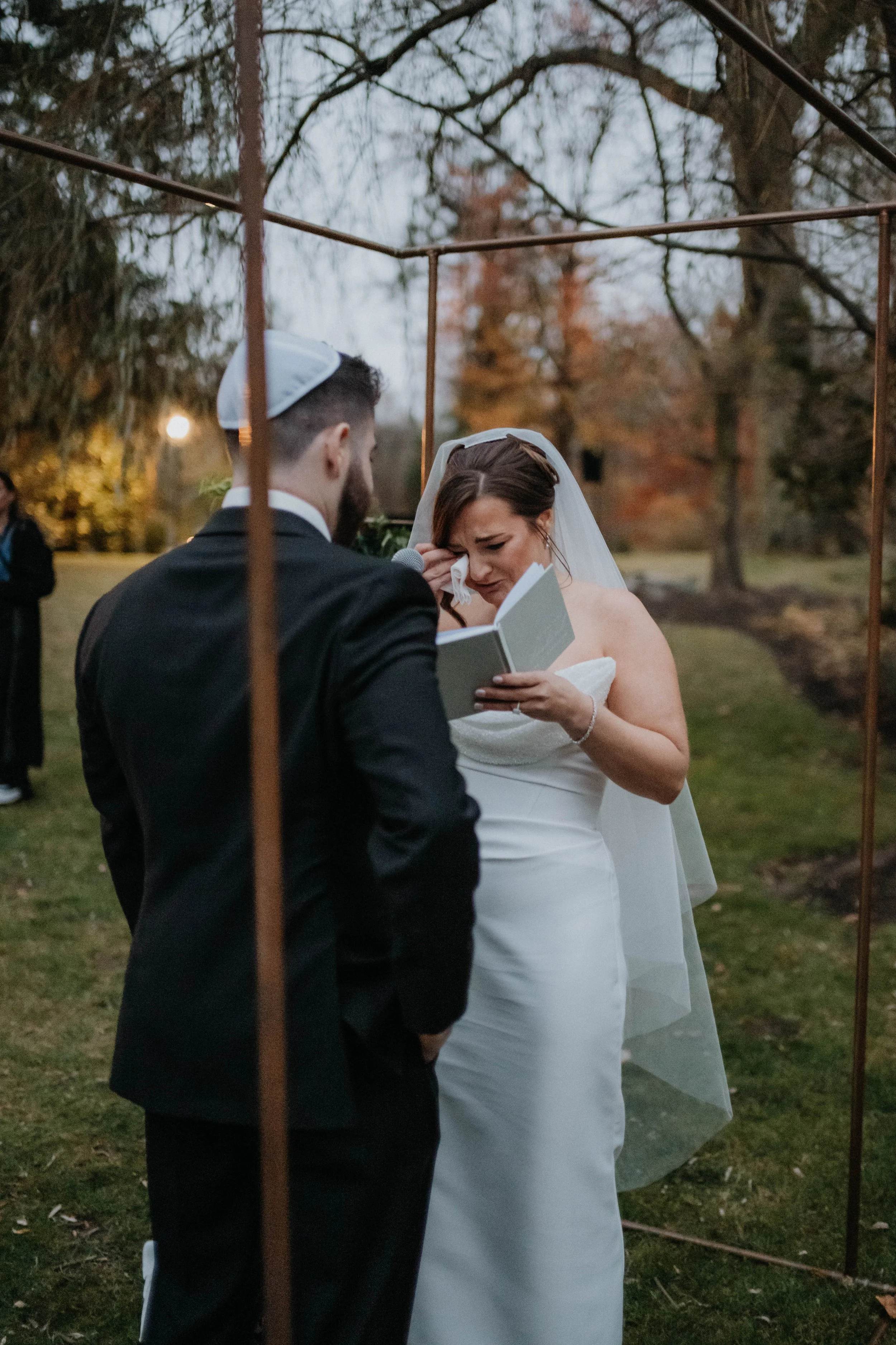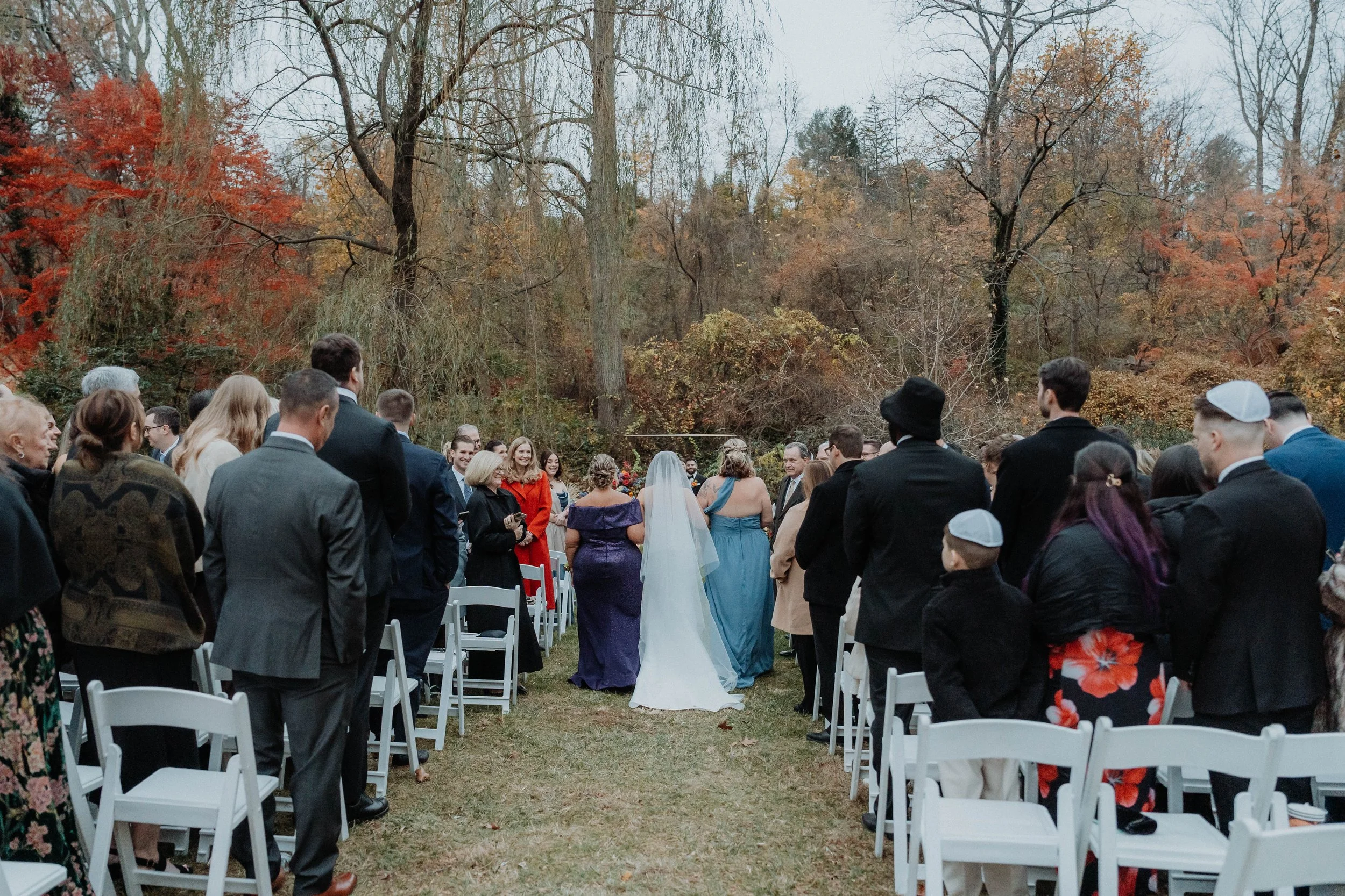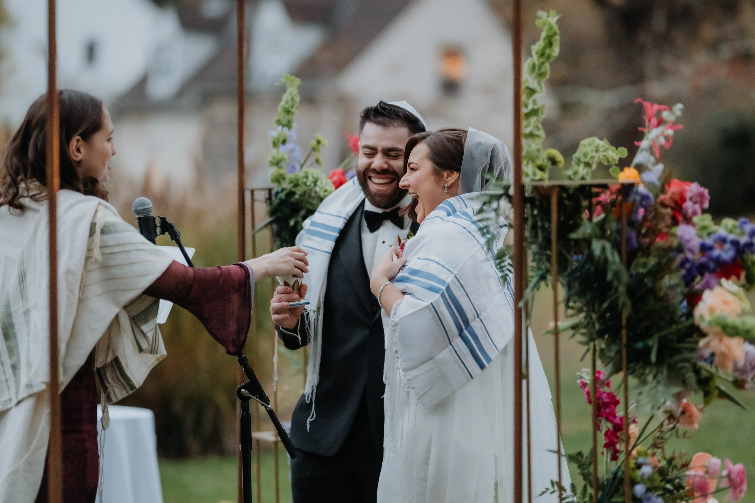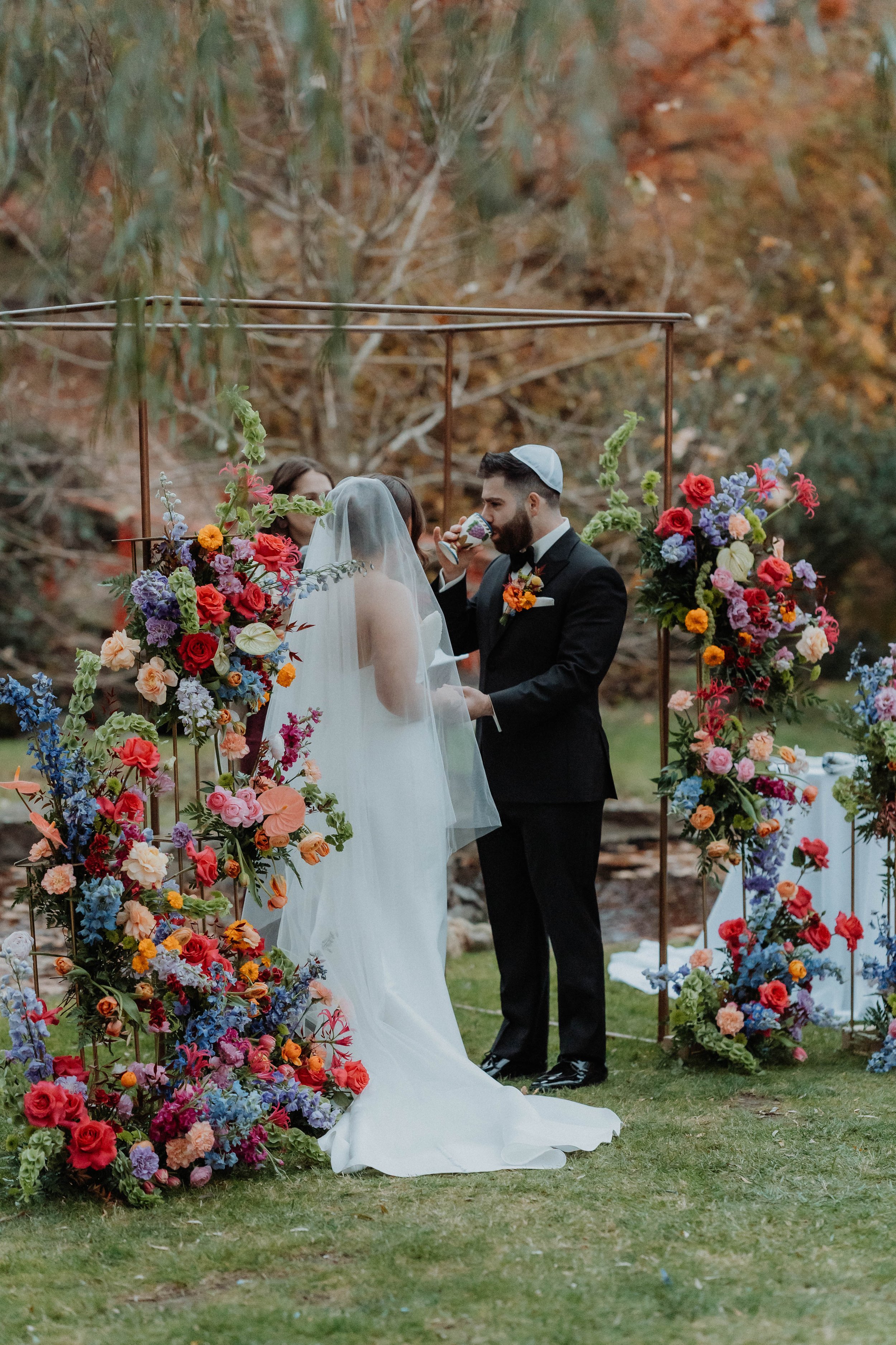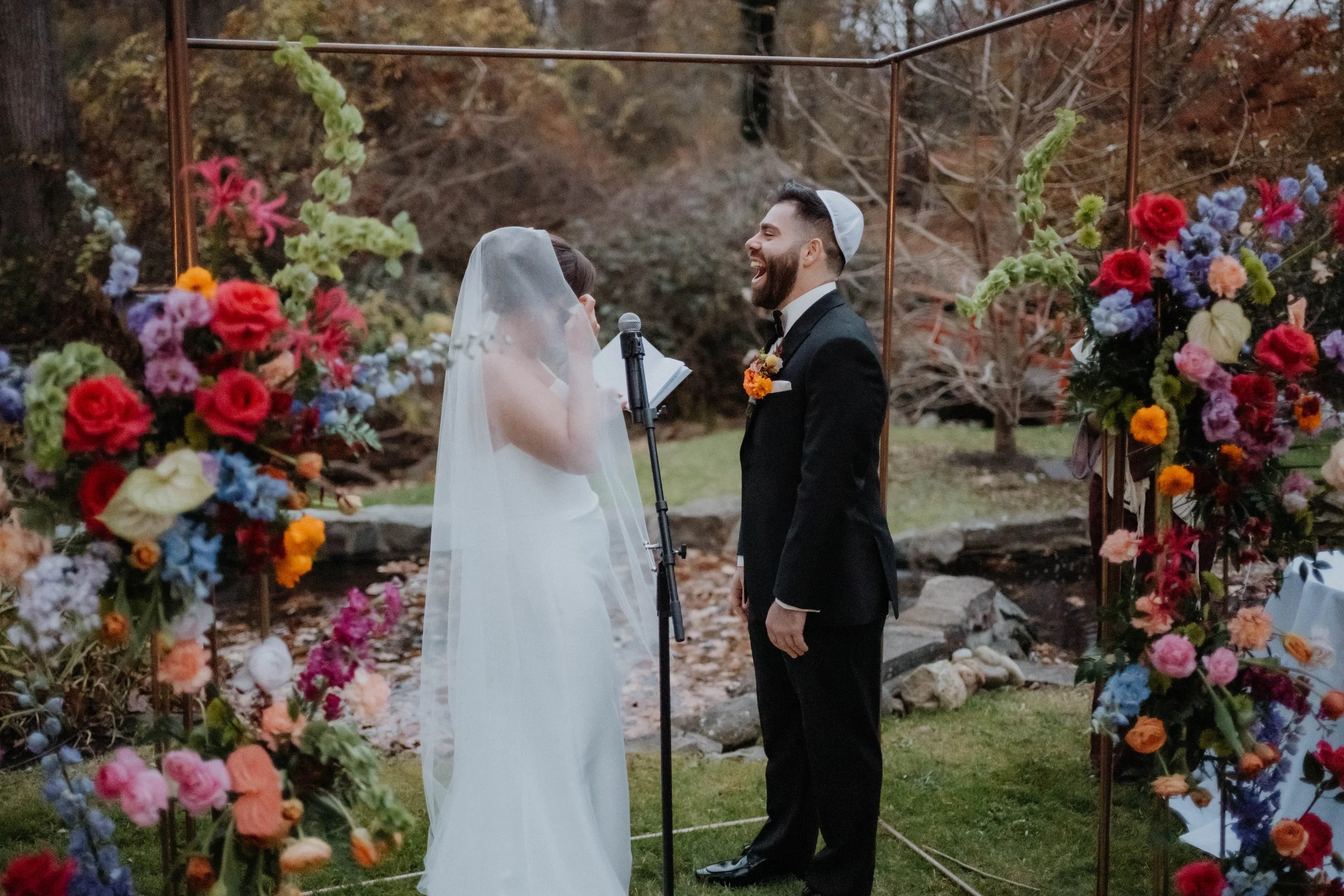 We took Rachael's vision of jewel tones and created a stunning color palette - think bright teal, berry, maroon, various shades of purple, mustard, and more. We based all of the design decisions around said palette. When it came to choosing a florist, the choice could not have been more obvious. Misha at Woodland Floral knows how to take a color palette on paper and bring it to life with stunning flowers. Rachael’s bouquet? That chuppah? Those centerpieces? The seating chart arrangements? All to-die-for.