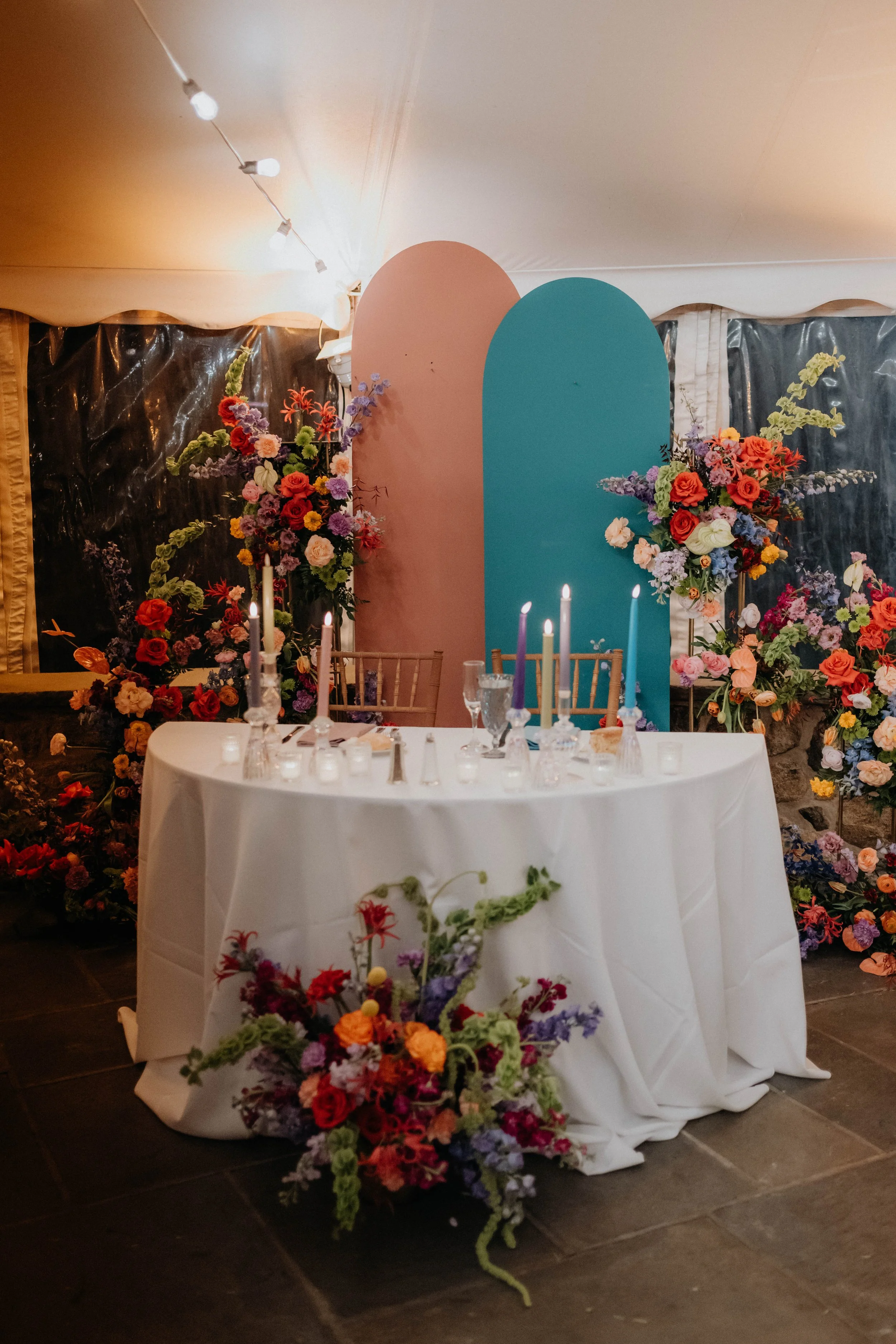 Creamery Hill also made two show-stoppers for the big day. The first, being the super funky seating chart and the second being the welcome moment that then transformed into the sweetheart table backdrop. All of the custom-built signage was created in varying colors from their palette. Kelsey of Creamery Hill also provided multiple furniture lounges that were set up in the cocktail hour area, which indeed both stunning pops of color and practical places for guests to lounge.